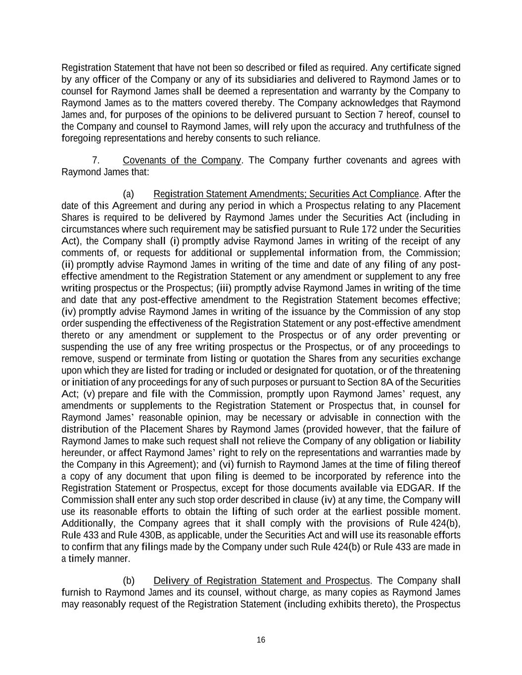 16 Registration Statement that have not been so described or filed as required. Any certificate signed by any officer of the Company or any of its subsidiaries and delivered to Raymond James or to counsel for Raymond James shall be deemed a representation and warranty by the Company to Raymond James as to the matters covered thereby. The Company acknowledges that Raymond James and, for purposes of the opinions to be delivered pursuant to Section 7 hereof, counsel to the Company and counsel to Raymond James, will rely upon the accuracy and truthfulness of the foregoing representations and hereby consents to such reliance. 7. Covenants of the Company. The Company further covenants and agrees with Raymond James that: (a) Registration Statement Amendments; Securities Act Compliance. After the date of this Agreement and during any period in which a Prospectus relating to any Placement Shares is required to be delivered by Raymond James under the Securities Act (including in circumstances where such requirement may be satisfied pursuant to Rule 172 under the Securities Act), the Company shall (i) promptly advise Raymond James in writing of the receipt of any comments of, or requests for additional or supplemental information from, the Commission; (ii) promptly advise Raymond James in writing of the time and date of any filing of any post- effective amendment to the Registration Statement or any amendment or supplement to any free writing prospectus or the Prospectus; (iii) promptly advise Raymond James in writing of the time and date that any post-effective amendment to the Registration Statement becomes effective; (iv) promptly advise Raymond James in writing of the issuance by the Commission of any stop order suspending the effectiveness of the Registration Statement or any post-effective amendment thereto or any amendment or supplement to the Prospectus or of any order preventing or suspending the use of any free writing prospectus or the Prospectus, or of any proceedings to remove, suspend or terminate from listing or quotation the Shares from any securities exchange upon which they are listed for trading or included or designated for quotation, or of the threatening or initiation of any proceedings for any of such purposes or pursuant to Section 8A of the Securities Act; (v) prepare and file with the Commission, promptly upon Raymond James’ request, any amendments or supplements to the Registration Statement or Prospectus that, in counsel for Raymond James’ reasonable opinion, may be necessary or advisable in connection with the distribution of the Placement Shares by Raymond James (provided however, that the failure of Raymond James to make such request shall not relieve the Company of any obligation or liability hereunder, or affect Raymond James’ right to rely on the representations and warranties made by the Company in this Agreement); and (vi) furnish to Raymond James at the time of filing thereof a copy of any document that upon filing is deemed to be incorporated by reference into the Registration Statement or Prospectus, except for those documents available via EDGAR. If the Commission shall enter any such stop order described in clause (iv) at any time, the Company will use its reasonable efforts to obtain the lifting of such order at the earliest possible moment. Additionally, the Company agrees that it shall comply with the provisions of Rule 424(b), Rule 433 and Rule 430B, as applicable, under the Securities Act and will use its reasonable efforts to confirm that any filings made by the Company under such Rule 424(b) or Rule 433 are made in a timely manner. (b) Delivery of Registration Statement and Prospectus. The Company shall furnish to Raymond James and its counsel, without charge, as many copies as Raymond James may reasonably request of the Registration Statement (including exhibits thereto), the Prospectus