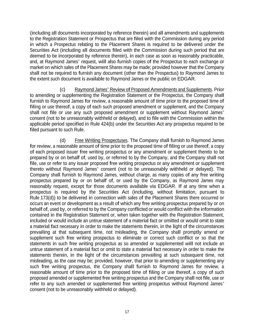 17 (including all documents incorporated by reference therein) and all amendments and supplements to the Registration Statement or Prospectus that are filed with the Commission during any period in which a Prospectus relating to the Placement Shares is required to be delivered under the Securities Act (including all documents filed with the Commission during such period that are deemed to be incorporated by reference therein), in each case as soon as reasonably practicable, and, at Raymond James’ request, will also furnish copies of the Prospectus to each exchange or market on which sales of the Placement Shares may be made; provided however that the Company shall not be required to furnish any document (other than the Prospectus) to Raymond James to the extent such document is available to Raymond James or the public on EDGAR. (c) Raymond James’ Review of Proposed Amendments and Supplements. Prior to amending or supplementing the Registration Statement or the Prospectus, the Company shall furnish to Raymond James for review, a reasonable amount of time prior to the proposed time of filing or use thereof, a copy of each such proposed amendment or supplement, and the Company shall not file or use any such proposed amendment or supplement without Raymond James’ consent (not to be unreasonably withheld or delayed), and to file with the Commission within the applicable period specified in Rule 424(b) under the Securities Act any prospectus required to be filed pursuant to such Rule. (d) Free Writing Prospectuses. The Company shall furnish to Raymond James for review, a reasonable amount of time prior to the proposed time of filing or use thereof, a copy of each proposed issuer free writing prospectus or any amendment or supplement thereto to be prepared by or on behalf of, used by, or referred to by the Company, and the Company shall not file, use or refer to any issuer proposed free writing prospectus or any amendment or supplement thereto without Raymond James’ consent (not to be unreasonably withheld or delayed). The Company shall furnish to Raymond James, without charge, as many copies of any free writing prospectus prepared by or on behalf of, or used by the Company, as Raymond James may reasonably request, except for those documents available via EDGAR. If at any time when a prospectus is required by the Securities Act (including, without limitation, pursuant to Rule 173(d)) to be delivered in connection with sales of the Placement Shares there occurred or occurs an event or development as a result of which any free writing prospectus prepared by or on behalf of, used by, or referred to by the Company conflicted or would conflict with the information contained in the Registration Statement or, when taken together with the Registration Statement, included or would include an untrue statement of a material fact or omitted or would omit to state a material fact necessary in order to make the statements therein, in the light of the circumstances prevailing at that subsequent time, not misleading, the Company shall promptly amend or supplement such free writing prospectus to eliminate or correct such conflict or so that the statements in such free writing prospectus as so amended or supplemented will not include an untrue statement of a material fact or omit to state a material fact necessary in order to make the statements therein, in the light of the circumstances prevailing at such subsequent time, not misleading, as the case may be; provided, however, that prior to amending or supplementing any such free writing prospectus, the Company shall furnish to Raymond James for review, a reasonable amount of time prior to the proposed time of filing or use thereof, a copy of such proposed amended or supplemented free writing prospectus and the Company shall not file, use or refer to any such amended or supplemented free writing prospectus without Raymond James’ consent (not to be unreasonably withheld or delayed).