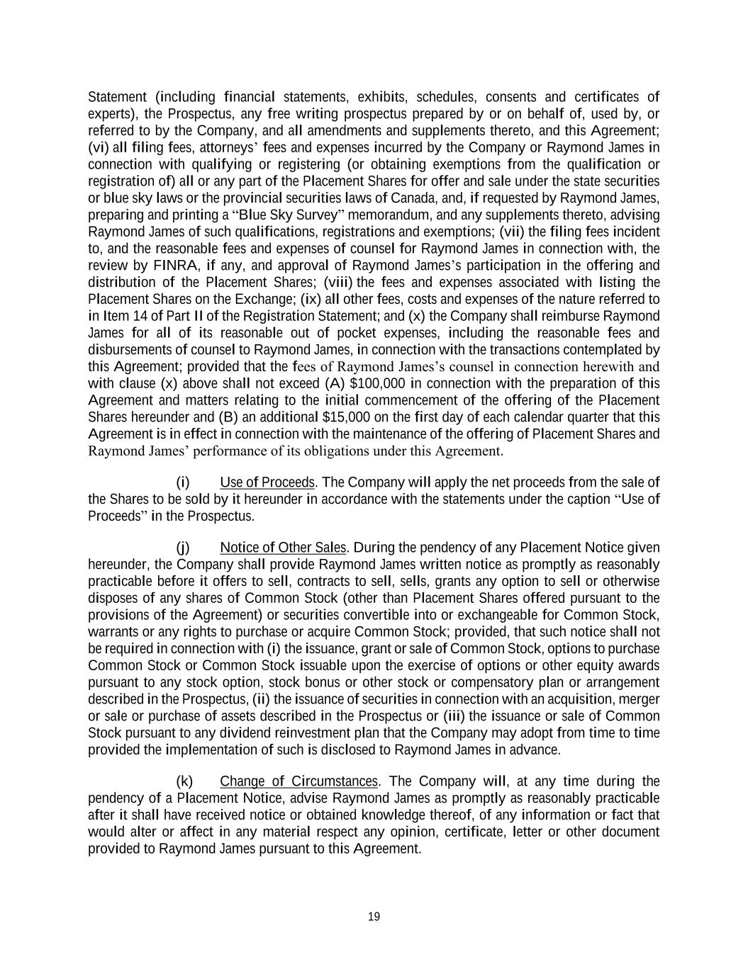 19 Statement (including financial statements, exhibits, schedules, consents and certificates of experts), the Prospectus, any free writing prospectus prepared by or on behalf of, used by, or referred to by the Company, and all amendments and supplements thereto, and this Agreement; (vi) all filing fees, attorneys’ fees and expenses incurred by the Company or Raymond James in connection with qualifying or registering (or obtaining exemptions from the qualification or registration of) all or any part of the Placement Shares for offer and sale under the state securities or blue sky laws or the provincial securities laws of Canada, and, if requested by Raymond James, preparing and printing a “Blue Sky Survey” memorandum, and any supplements thereto, advising Raymond James of such qualifications, registrations and exemptions; (vii) the filing fees incident to, and the reasonable fees and expenses of counsel for Raymond James in connection with, the review by FINRA, if any, and approval of Raymond James’s participation in the offering and distribution of the Placement Shares; (viii) the fees and expenses associated with listing the Placement Shares on the Exchange; (ix) all other fees, costs and expenses of the nature referred to in Item 14 of Part II of the Registration Statement; and (x) the Company shall reimburse Raymond James for all of its reasonable out of pocket expenses, including the reasonable fees and disbursements of counsel to Raymond James, in connection with the transactions contemplated by this Agreement; provided that the fees of Raymond James’s counsel in connection herewith and with clause (x) above shall not exceed (A) $100,000 in connection with the preparation of this Agreement and matters relating to the initial commencement of the offering of the Placement Shares hereunder and (B) an additional $15,000 on the first day of each calendar quarter that this Agreement is in effect in connection with the maintenance of the offering of Placement Shares and Raymond James’ performance of its obligations under this Agreement. (i) Use of Proceeds. The Company will apply the net proceeds from the sale of the Shares to be sold by it hereunder in accordance with the statements under the caption “Use of Proceeds” in the Prospectus. (j) Notice of Other Sales. During the pendency of any Placement Notice given hereunder, the Company shall provide Raymond James written notice as promptly as reasonably practicable before it offers to sell, contracts to sell, sells, grants any option to sell or otherwise disposes of any shares of Common Stock (other than Placement Shares offered pursuant to the provisions of the Agreement) or securities convertible into or exchangeable for Common Stock, warrants or any rights to purchase or acquire Common Stock; provided, that such notice shall not be required in connection with (i) the issuance, grant or sale of Common Stock, options to purchase Common Stock or Common Stock issuable upon the exercise of options or other equity awards pursuant to any stock option, stock bonus or other stock or compensatory plan or arrangement described in the Prospectus, (ii) the issuance of securities in connection with an acquisition, merger or sale or purchase of assets described in the Prospectus or (iii) the issuance or sale of Common Stock pursuant to any dividend reinvestment plan that the Company may adopt from time to time provided the implementation of such is disclosed to Raymond James in advance. (k) Change of Circumstances. The Company will, at any time during the pendency of a Placement Notice, advise Raymond James as promptly as reasonably practicable after it shall have received notice or obtained knowledge thereof, of any information or fact that would alter or affect in any material respect any opinion, certificate, letter or other document provided to Raymond James pursuant to this Agreement.