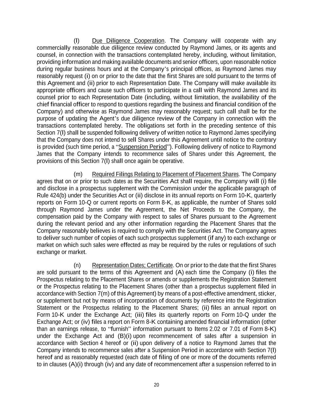 20 (l) Due Diligence Cooperation. The Company will cooperate with any commercially reasonable due diligence review conducted by Raymond James, or its agents and counsel, in connection with the transactions contemplated hereby, including, without limitation, providing information and making available documents and senior officers, upon reasonable notice during regular business hours and at the Company’s principal offices, as Raymond James may reasonably request (i) on or prior to the date that the first Shares are sold pursuant to the terms of this Agreement and (ii) prior to each Representation Date. The Company will make available its appropriate officers and cause such officers to participate in a call with Raymond James and its counsel prior to each Representation Date (including, without limitation, the availability of the chief financial officer to respond to questions regarding the business and financial condition of the Company) and otherwise as Raymond James may reasonably request; such call shall be for the purpose of updating the Agent’s due diligence review of the Company in connection with the transactions contemplated hereby. The obligations set forth in the preceding sentence of this Section 7(l) shall be suspended following delivery of written notice to Raymond James specifying that the Company does not intend to sell Shares under this Agreement until notice to the contrary is provided (such time period, a “Suspension Period”). Following delivery of notice to Raymond James that the Company intends to recommence sales of Shares under this Agreement, the provisions of this Section 7(l) shall once again be operative. (m) Required Filings Relating to Placement of Placement Shares. The Company agrees that on or prior to such dates as the Securities Act shall require, the Company will (i) file and disclose in a prospectus supplement with the Commission under the applicable paragraph of Rule 424(b) under the Securities Act or (ii) disclose in its annual reports on Form 10-K, quarterly reports on Form 10-Q or current reports on Form 8-K, as applicable, the number of Shares sold through Raymond James under the Agreement, the Net Proceeds to the Company, the compensation paid by the Company with respect to sales of Shares pursuant to the Agreement during the relevant period and any other information regarding the Placement Shares that the Company reasonably believes is required to comply with the Securities Act. The Company agrees to deliver such number of copies of each such prospectus supplement (if any) to each exchange or market on which such sales were effected as may be required by the rules or regulations of such exchange or market. (n) Representation Dates; Certificate. On or prior to the date that the first Shares are sold pursuant to the terms of this Agreement and (A) each time the Company (i) files the Prospectus relating to the Placement Shares or amends or supplements the Registration Statement or the Prospectus relating to the Placement Shares (other than a prospectus supplement filed in accordance with Section 7(m) of this Agreement) by means of a post-effective amendment, sticker, or supplement but not by means of incorporation of documents by reference into the Registration Statement or the Prospectus relating to the Placement Shares; (ii) files an annual report on Form 10-K under the Exchange Act; (iii) files its quarterly reports on Form 10-Q under the Exchange Act; or (iv) files a report on Form 8-K containing amended financial information (other than an earnings release, to “furnish” information pursuant to Items 2.02 or 7.01 of Form 8-K) under the Exchange Act and (B)(i) upon recommencement of sales after a suspension in accordance with Section 4 hereof or (ii) upon delivery of a notice to Raymond James that the Company intends to recommence sales after a Suspension Period in accordance with Section 7(l) hereof and as reasonably requested (each date of filing of one or more of the documents referred to in clauses (A)(i) through (iv) and any date of recommencement after a suspension referred to in