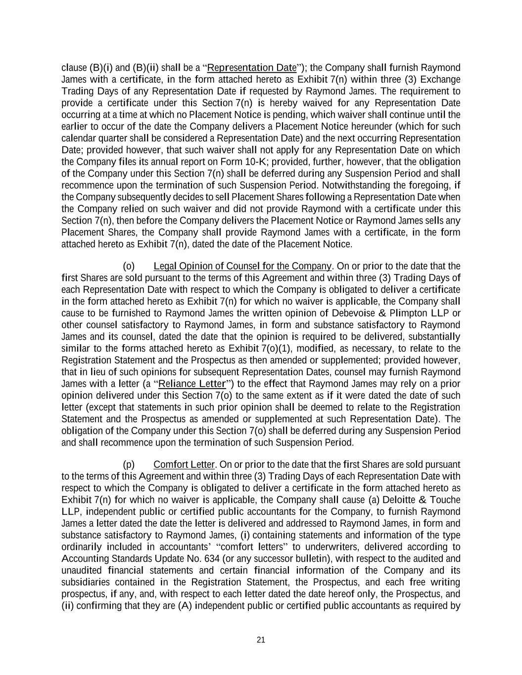 21 clause (B)(i) and (B)(ii) shall be a “Representation Date”); the Company shall furnish Raymond James with a certificate, in the form attached hereto as Exhibit 7(n) within three (3) Exchange Trading Days of any Representation Date if requested by Raymond James. The requirement to provide a certificate under this Section 7(n) is hereby waived for any Representation Date occurring at a time at which no Placement Notice is pending, which waiver shall continue until the earlier to occur of the date the Company delivers a Placement Notice hereunder (which for such calendar quarter shall be considered a Representation Date) and the next occurring Representation Date; provided however, that such waiver shall not apply for any Representation Date on which the Company files its annual report on Form 10-K; provided, further, however, that the obligation of the Company under this Section 7(n) shall be deferred during any Suspension Period and shall recommence upon the termination of such Suspension Period. Notwithstanding the foregoing, if the Company subsequently decides to sell Placement Shares following a Representation Date when the Company relied on such waiver and did not provide Raymond with a certificate under this Section 7(n), then before the Company delivers the Placement Notice or Raymond James sells any Placement Shares, the Company shall provide Raymond James with a certificate, in the form attached hereto as Exhibit 7(n), dated the date of the Placement Notice. (o) Legal Opinion of Counsel for the Company. On or prior to the date that the first Shares are sold pursuant to the terms of this Agreement and within three (3) Trading Days of each Representation Date with respect to which the Company is obligated to deliver a certificate in the form attached hereto as Exhibit 7(n) for which no waiver is applicable, the Company shall cause to be furnished to Raymond James the written opinion of Debevoise & Plimpton LLP or other counsel satisfactory to Raymond James, in form and substance satisfactory to Raymond James and its counsel, dated the date that the opinion is required to be delivered, substantially similar to the forms attached hereto as Exhibit 7(o)(1), modified, as necessary, to relate to the Registration Statement and the Prospectus as then amended or supplemented; provided however, that in lieu of such opinions for subsequent Representation Dates, counsel may furnish Raymond James with a letter (a “Reliance Letter”) to the effect that Raymond James may rely on a prior opinion delivered under this Section 7(o) to the same extent as if it were dated the date of such letter (except that statements in such prior opinion shall be deemed to relate to the Registration Statement and the Prospectus as amended or supplemented at such Representation Date). The obligation of the Company under this Section 7(o) shall be deferred during any Suspension Period and shall recommence upon the termination of such Suspension Period. (p) Comfort Letter. On or prior to the date that the first Shares are sold pursuant to the terms of this Agreement and within three (3) Trading Days of each Representation Date with respect to which the Company is obligated to deliver a certificate in the form attached hereto as Exhibit 7(n) for which no waiver is applicable, the Company shall cause (a) Deloitte & Touche LLP, independent public or certified public accountants for the Company, to furnish Raymond James a letter dated the date the letter is delivered and addressed to Raymond James, in form and substance satisfactory to Raymond James, (i) containing statements and information of the type ordinarily included in accountants’ “comfort letters” to underwriters, delivered according to Accounting Standards Update No. 634 (or any successor bulletin), with respect to the audited and unaudited financial statements and certain financial information of the Company and its subsidiaries contained in the Registration Statement, the Prospectus, and each free writing prospectus, if any, and, with respect to each letter dated the date hereof only, the Prospectus, and (ii) confirming that they are (A) independent public or certified public accountants as required by