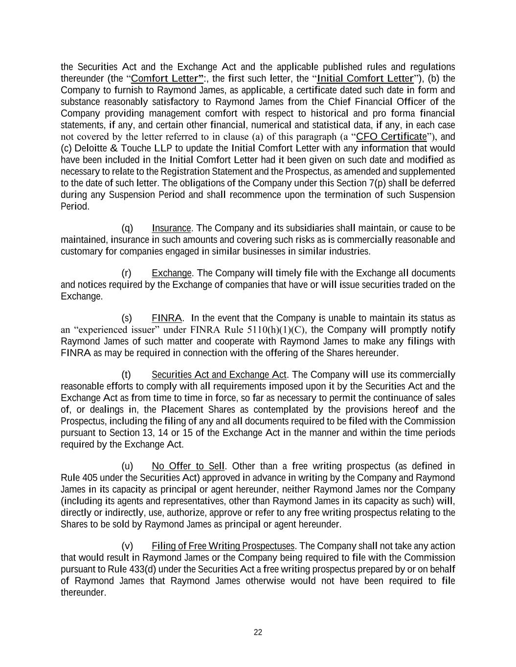 22 the Securities Act and the Exchange Act and the applicable published rules and regulations thereunder (the “Comfort Letter”:, the first such letter, the “Initial Comfort Letter”), (b) the Company to furnish to Raymond James, as applicable, a certificate dated such date in form and substance reasonably satisfactory to Raymond James from the Chief Financial Officer of the Company providing management comfort with respect to historical and pro forma financial statements, if any, and certain other financial, numerical and statistical data, if any, in each case not covered by the letter referred to in clause (a) of this paragraph (a “CFO Certificate”), and (c) Deloitte & Touche LLP to update the Initial Comfort Letter with any information that would have been included in the Initial Comfort Letter had it been given on such date and modified as necessary to relate to the Registration Statement and the Prospectus, as amended and supplemented to the date of such letter. The obligations of the Company under this Section 7(p) shall be deferred during any Suspension Period and shall recommence upon the termination of such Suspension Period. (q) Insurance. The Company and its subsidiaries shall maintain, or cause to be maintained, insurance in such amounts and covering such risks as is commercially reasonable and customary for companies engaged in similar businesses in similar industries. (r) Exchange. The Company will timely file with the Exchange all documents and notices required by the Exchange of companies that have or will issue securities traded on the Exchange. (s) FINRA. In the event that the Company is unable to maintain its status as an “experienced issuer” under FINRA Rule 5110(h)(1)(C), the Company will promptly notify Raymond James of such matter and cooperate with Raymond James to make any filings with FINRA as may be required in connection with the offering of the Shares hereunder. (t) Securities Act and Exchange Act. The Company will use its commercially reasonable efforts to comply with all requirements imposed upon it by the Securities Act and the Exchange Act as from time to time in force, so far as necessary to permit the continuance of sales of, or dealings in, the Placement Shares as contemplated by the provisions hereof and the Prospectus, including the filing of any and all documents required to be filed with the Commission pursuant to Section 13, 14 or 15 of the Exchange Act in the manner and within the time periods required by the Exchange Act. (u) No Offer to Sell. Other than a free writing prospectus (as defined in Rule 405 under the Securities Act) approved in advance in writing by the Company and Raymond James in its capacity as principal or agent hereunder, neither Raymond James nor the Company (including its agents and representatives, other than Raymond James in its capacity as such) will, directly or indirectly, use, authorize, approve or refer to any free writing prospectus relating to the Shares to be sold by Raymond James as principal or agent hereunder. (v) Filing of Free Writing Prospectuses. The Company shall not take any action that would result in Raymond James or the Company being required to file with the Commission pursuant to Rule 433(d) under the Securities Act a free writing prospectus prepared by or on behalf of Raymond James that Raymond James otherwise would not have been required to file thereunder.