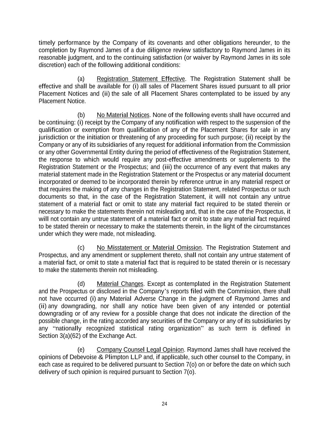 24 timely performance by the Company of its covenants and other obligations hereunder, to the completion by Raymond James of a due diligence review satisfactory to Raymond James in its reasonable judgment, and to the continuing satisfaction (or waiver by Raymond James in its sole discretion) each of the following additional conditions: (a) Registration Statement Effective. The Registration Statement shall be effective and shall be available for (i) all sales of Placement Shares issued pursuant to all prior Placement Notices and (ii) the sale of all Placement Shares contemplated to be issued by any Placement Notice. (b) No Material Notices. None of the following events shall have occurred and be continuing: (i) receipt by the Company of any notification with respect to the suspension of the qualification or exemption from qualification of any of the Placement Shares for sale in any jurisdiction or the initiation or threatening of any proceeding for such purpose; (ii) receipt by the Company or any of its subsidiaries of any request for additional information from the Commission or any other Governmental Entity during the period of effectiveness of the Registration Statement, the response to which would require any post-effective amendments or supplements to the Registration Statement or the Prospectus; and (iii) the occurrence of any event that makes any material statement made in the Registration Statement or the Prospectus or any material document incorporated or deemed to be incorporated therein by reference untrue in any material respect or that requires the making of any changes in the Registration Statement, related Prospectus or such documents so that, in the case of the Registration Statement, it will not contain any untrue statement of a material fact or omit to state any material fact required to be stated therein or necessary to make the statements therein not misleading and, that in the case of the Prospectus, it will not contain any untrue statement of a material fact or omit to state any material fact required to be stated therein or necessary to make the statements therein, in the light of the circumstances under which they were made, not misleading. (c) No Misstatement or Material Omission. The Registration Statement and Prospectus, and any amendment or supplement thereto, shall not contain any untrue statement of a material fact, or omit to state a material fact that is required to be stated therein or is necessary to make the statements therein not misleading. (d) Material Changes. Except as contemplated in the Registration Statement and the Prospectus or disclosed in the Company’s reports filed with the Commission, there shall not have occurred (i) any Material Adverse Change in the judgment of Raymond James and (ii) any downgrading, nor shall any notice have been given of any intended or potential downgrading or of any review for a possible change that does not indicate the direction of the possible change, in the rating accorded any securities of the Company or any of its subsidiaries by any “nationally recognized statistical rating organization” as such term is defined in Section 3(a)(62) of the Exchange Act. (e) Company Counsel Legal Opinion. Raymond James shall have received the opinions of Debevoise & Plimpton LLP and, if applicable, such other counsel to the Company, in each case as required to be delivered pursuant to Section 7(o) on or before the date on which such delivery of such opinion is required pursuant to Section 7(o).