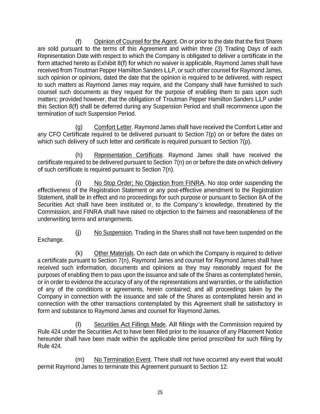25 (f) Opinion of Counsel for the Agent. On or prior to the date that the first Shares are sold pursuant to the terms of this Agreement and within three (3) Trading Days of each Representation Date with respect to which the Company is obligated to deliver a certificate in the form attached hereto as Exhibit 8(f) for which no waiver is applicable, Raymond James shall have received from Troutman Pepper Hamilton Sanders LLP, or such other counsel for Raymond James, such opinion or opinions, dated the date that the opinion is required to be delivered, with respect to such matters as Raymond James may require, and the Company shall have furnished to such counsel such documents as they request for the purpose of enabling them to pass upon such matters; provided however, that the obligation of Troutman Pepper Hamilton Sanders LLP under this Section 8(f) shall be deferred during any Suspension Period and shall recommence upon the termination of such Suspension Period. (g) Comfort Letter. Raymond James shall have received the Comfort Letter and any CFO Certificate required to be delivered pursuant to Section 7(p) on or before the dates on which such delivery of such letter and certificate is required pursuant to Section 7(p). (h) Representation Certificate. Raymond James shall have received the certificate required to be delivered pursuant to Section 7(n) on or before the date on which delivery of such certificate is required pursuant to Section 7(n). (i) No Stop Order; No Objection from FINRA. No stop order suspending the effectiveness of the Registration Statement or any post-effective amendment to the Registration Statement, shall be in effect and no proceedings for such purpose or pursuant to Section 8A of the Securities Act shall have been instituted or, to the Company’s knowledge, threatened by the Commission, and FINRA shall have raised no objection to the fairness and reasonableness of the underwriting terms and arrangements. (j) No Suspension. Trading in the Shares shall not have been suspended on the Exchange. (k) Other Materials. On each date on which the Company is required to deliver a certificate pursuant to Section 7(n), Raymond James and counsel for Raymond James shall have received such information, documents and opinions as they may reasonably request for the purposes of enabling them to pass upon the issuance and sale of the Shares as contemplated herein, or in order to evidence the accuracy of any of the representations and warranties, or the satisfaction of any of the conditions or agreements, herein contained; and all proceedings taken by the Company in connection with the issuance and sale of the Shares as contemplated herein and in connection with the other transactions contemplated by this Agreement shall be satisfactory in form and substance to Raymond James and counsel for Raymond James. (l) Securities Act Filings Made. All filings with the Commission required by Rule 424 under the Securities Act to have been filed prior to the issuance of any Placement Notice hereunder shall have been made within the applicable time period prescribed for such filing by Rule 424. (m) No Termination Event. There shall not have occurred any event that would permit Raymond James to terminate this Agreement pursuant to Section 12.