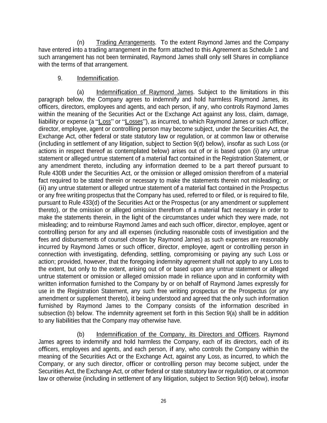 26 (n) Trading Arrangements. To the extent Raymond James and the Company have entered into a trading arrangement in the form attached to this Agreement as Schedule 1 and such arrangement has not been terminated, Raymond James shall only sell Shares in compliance with the terms of that arrangement. 9. Indemnification. (a) Indemnification of Raymond James. Subject to the limitations in this paragraph below, the Company agrees to indemnify and hold harmless Raymond James, its officers, directors, employees and agents, and each person, if any, who controls Raymond James within the meaning of the Securities Act or the Exchange Act against any loss, claim, damage, liability or expense (a “Loss” or “Losses”), as incurred, to which Raymond James or such officer, director, employee, agent or controlling person may become subject, under the Securities Act, the Exchange Act, other federal or state statutory law or regulation, or at common law or otherwise (including in settlement of any litigation, subject to Section 9(d) below), insofar as such Loss (or actions in respect thereof as contemplated below) arises out of or is based upon (i) any untrue statement or alleged untrue statement of a material fact contained in the Registration Statement, or any amendment thereto, including any information deemed to be a part thereof pursuant to Rule 430B under the Securities Act, or the omission or alleged omission therefrom of a material fact required to be stated therein or necessary to make the statements therein not misleading; or (ii) any untrue statement or alleged untrue statement of a material fact contained in the Prospectus or any free writing prospectus that the Company has used, referred to or filed, or is required to file, pursuant to Rule 433(d) of the Securities Act or the Prospectus (or any amendment or supplement thereto), or the omission or alleged omission therefrom of a material fact necessary in order to make the statements therein, in the light of the circumstances under which they were made, not misleading; and to reimburse Raymond James and each such officer, director, employee, agent or controlling person for any and all expenses (including reasonable costs of investigation and the fees and disbursements of counsel chosen by Raymond James) as such expenses are reasonably incurred by Raymond James or such officer, director, employee, agent or controlling person in connection with investigating, defending, settling, compromising or paying any such Loss or action; provided, however, that the foregoing indemnity agreement shall not apply to any Loss to the extent, but only to the extent, arising out of or based upon any untrue statement or alleged untrue statement or omission or alleged omission made in reliance upon and in conformity with written information furnished to the Company by or on behalf of Raymond James expressly for use in the Registration Statement, any such free writing prospectus or the Prospectus (or any amendment or supplement thereto), it being understood and agreed that the only such information furnished by Raymond James to the Company consists of the information described in subsection (b) below. The indemnity agreement set forth in this Section 9(a) shall be in addition to any liabilities that the Company may otherwise have. (b) Indemnification of the Company, its Directors and Officers. Raymond James agrees to indemnify and hold harmless the Company, each of its directors, each of its officers, employees and agents, and each person, if any, who controls the Company within the meaning of the Securities Act or the Exchange Act, against any Loss, as incurred, to which the Company, or any such director, officer or controlling person may become subject, under the Securities Act, the Exchange Act, or other federal or state statutory law or regulation, or at common law or otherwise (including in settlement of any litigation, subject to Section 9(d) below), insofar