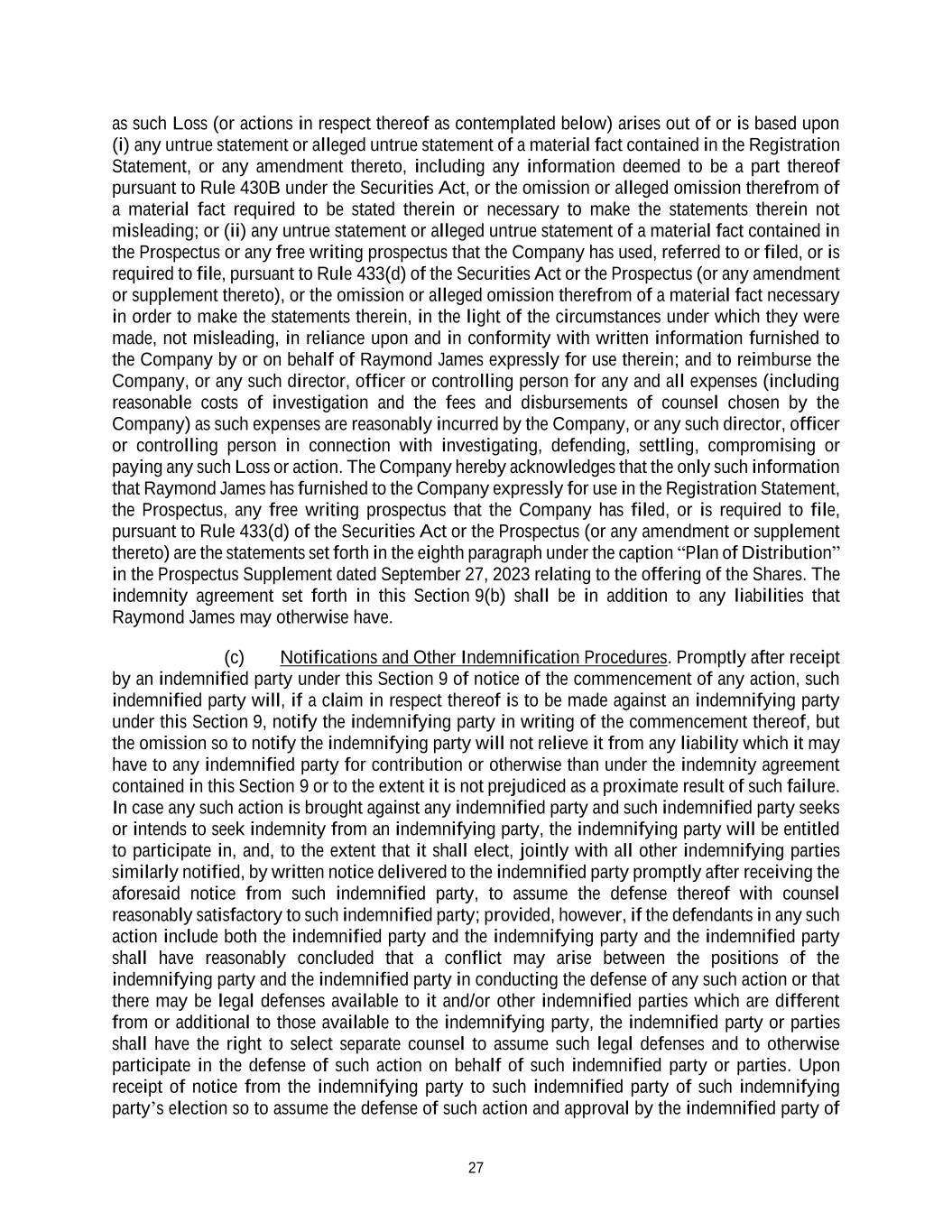 27 as such Loss (or actions in respect thereof as contemplated below) arises out of or is based upon (i) any untrue statement or alleged untrue statement of a material fact contained in the Registration Statement, or any amendment thereto, including any information deemed to be a part thereof pursuant to Rule 430B under the Securities Act, or the omission or alleged omission therefrom of a material fact required to be stated therein or necessary to make the statements therein not misleading; or (ii) any untrue statement or alleged untrue statement of a material fact contained in the Prospectus or any free writing prospectus that the Company has used, referred to or filed, or is required to file, pursuant to Rule 433(d) of the Securities Act or the Prospectus (or any amendment or supplement thereto), or the omission or alleged omission therefrom of a material fact necessary in order to make the statements therein, in the light of the circumstances under which they were made, not misleading, in reliance upon and in conformity with written information furnished to the Company by or on behalf of Raymond James expressly for use therein; and to reimburse the Company, or any such director, officer or controlling person for any and all expenses (including reasonable costs of investigation and the fees and disbursements of counsel chosen by the Company) as such expenses are reasonably incurred by the Company, or any such director, officer or controlling person in connection with investigating, defending, settling, compromising or paying any such Loss or action. The Company hereby acknowledges that the only such information that Raymond James has furnished to the Company expressly for use in the Registration Statement, the Prospectus, any free writing prospectus that the Company has filed, or is required to file, pursuant to Rule 433(d) of the Securities Act or the Prospectus (or any amendment or supplement thereto) are the statements set forth in the eighth paragraph under the caption “Plan of Distribution” in the Prospectus Supplement dated September 27, 2023 relating to the offering of the Shares. The indemnity agreement set forth in this Section 9(b) shall be in addition to any liabilities that Raymond James may otherwise have. (c) Notifications and Other Indemnification Procedures. Promptly after receipt by an indemnified party under this Section 9 of notice of the commencement of any action, such indemnified party will, if a claim in respect thereof is to be made against an indemnifying party under this Section 9, notify the indemnifying party in writing of the commencement thereof, but the omission so to notify the indemnifying party will not relieve it from any liability which it may have to any indemnified party for contribution or otherwise than under the indemnity agreement contained in this Section 9 or to the extent it is not prejudiced as a proximate result of such failure. In case any such action is brought against any indemnified party and such indemnified party seeks or intends to seek indemnity from an indemnifying party, the indemnifying party will be entitled to participate in, and, to the extent that it shall elect, jointly with all other indemnifying parties similarly notified, by written notice delivered to the indemnified party promptly after receiving the aforesaid notice from such indemnified party, to assume the defense thereof with counsel reasonably satisfactory to such indemnified party; provided, however, if the defendants in any such action include both the indemnified party and the indemnifying party and the indemnified party shall have reasonably concluded that a conflict may arise between the positions of the indemnifying party and the indemnified party in conducting the defense of any such action or that there may be legal defenses available to it and/or other indemnified parties which are different from or additional to those available to the indemnifying party, the indemnified party or parties shall have the right to select separate counsel to assume such legal defenses and to otherwise participate in the defense of such action on behalf of such indemnified party or parties. Upon receipt of notice from the indemnifying party to such indemnified party of such indemnifying party’s election so to assume the defense of such action and approval by the indemnified party of