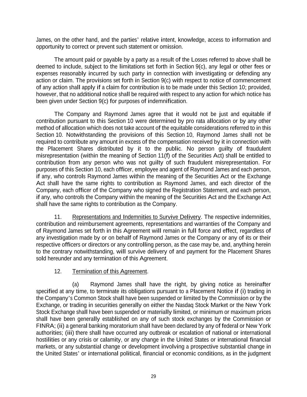 29 James, on the other hand, and the parties’ relative intent, knowledge, access to information and opportunity to correct or prevent such statement or omission. The amount paid or payable by a party as a result of the Losses referred to above shall be deemed to include, subject to the limitations set forth in Section 9(c), any legal or other fees or expenses reasonably incurred by such party in connection with investigating or defending any action or claim. The provisions set forth in Section 9(c) with respect to notice of commencement of any action shall apply if a claim for contribution is to be made under this Section 10; provided, however, that no additional notice shall be required with respect to any action for which notice has been given under Section 9(c) for purposes of indemnification. The Company and Raymond James agree that it would not be just and equitable if contribution pursuant to this Section 10 were determined by pro rata allocation or by any other method of allocation which does not take account of the equitable considerations referred to in this Section 10. Notwithstanding the provisions of this Section 10, Raymond James shall not be required to contribute any amount in excess of the compensation received by it in connection with the Placement Shares distributed by it to the public. No person guilty of fraudulent misrepresentation (within the meaning of Section 11(f) of the Securities Act) shall be entitled to contribution from any person who was not guilty of such fraudulent misrepresentation. For purposes of this Section 10, each officer, employee and agent of Raymond James and each person, if any, who controls Raymond James within the meaning of the Securities Act or the Exchange Act shall have the same rights to contribution as Raymond James, and each director of the Company, each officer of the Company who signed the Registration Statement, and each person, if any, who controls the Company within the meaning of the Securities Act and the Exchange Act shall have the same rights to contribution as the Company. 11. Representations and Indemnities to Survive Delivery. The respective indemnities, contribution and reimbursement agreements, representations and warranties of the Company and of Raymond James set forth in this Agreement will remain in full force and effect, regardless of any investigation made by or on behalf of Raymond James or the Company or any of its or their respective officers or directors or any controlling person, as the case may be, and, anything herein to the contrary notwithstanding, will survive delivery of and payment for the Placement Shares sold hereunder and any termination of this Agreement. 12. Termination of this Agreement. (a) Raymond James shall have the right, by giving notice as hereinafter specified at any time, to terminate its obligations pursuant to a Placement Notice if (i) trading in the Company’s Common Stock shall have been suspended or limited by the Commission or by the Exchange, or trading in securities generally on either the Nasdaq Stock Market or the New York Stock Exchange shall have been suspended or materially limited, or minimum or maximum prices shall have been generally established on any of such stock exchanges by the Commission or FINRA; (ii) a general banking moratorium shall have been declared by any of federal or New York authorities; (iii) there shall have occurred any outbreak or escalation of national or international hostilities or any crisis or calamity, or any change in the United States or international financial markets, or any substantial change or development involving a prospective substantial change in the United States’ or international political, financial or economic conditions, as in the judgment