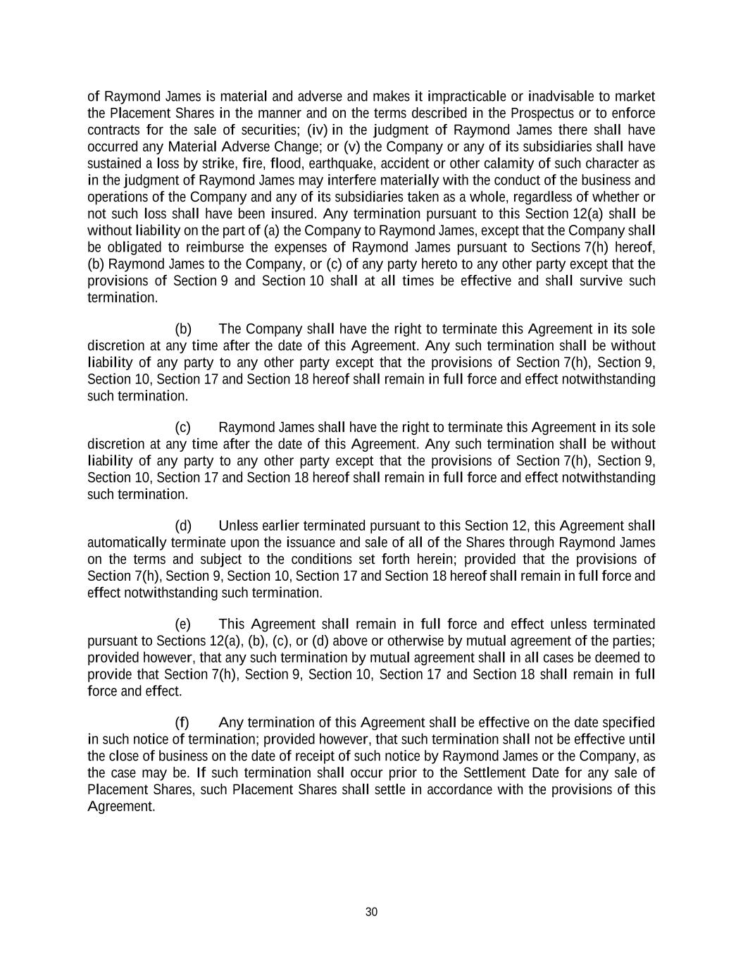 30 of Raymond James is material and adverse and makes it impracticable or inadvisable to market the Placement Shares in the manner and on the terms described in the Prospectus or to enforce contracts for the sale of securities; (iv) in the judgment of Raymond James there shall have occurred any Material Adverse Change; or (v) the Company or any of its subsidiaries shall have sustained a loss by strike, fire, flood, earthquake, accident or other calamity of such character as in the judgment of Raymond James may interfere materially with the conduct of the business and operations of the Company and any of its subsidiaries taken as a whole, regardless of whether or not such loss shall have been insured. Any termination pursuant to this Section 12(a) shall be without liability on the part of (a) the Company to Raymond James, except that the Company shall be obligated to reimburse the expenses of Raymond James pursuant to Sections 7(h) hereof, (b) Raymond James to the Company, or (c) of any party hereto to any other party except that the provisions of Section 9 and Section 10 shall at all times be effective and shall survive such termination. (b) The Company shall have the right to terminate this Agreement in its sole discretion at any time after the date of this Agreement. Any such termination shall be without liability of any party to any other party except that the provisions of Section 7(h), Section 9, Section 10, Section 17 and Section 18 hereof shall remain in full force and effect notwithstanding such termination. (c) Raymond James shall have the right to terminate this Agreement in its sole discretion at any time after the date of this Agreement. Any such termination shall be without liability of any party to any other party except that the provisions of Section 7(h), Section 9, Section 10, Section 17 and Section 18 hereof shall remain in full force and effect notwithstanding such termination. (d) Unless earlier terminated pursuant to this Section 12, this Agreement shall automatically terminate upon the issuance and sale of all of the Shares through Raymond James on the terms and subject to the conditions set forth herein; provided that the provisions of Section 7(h), Section 9, Section 10, Section 17 and Section 18 hereof shall remain in full force and effect notwithstanding such termination. (e) This Agreement shall remain in full force and effect unless terminated pursuant to Sections 12(a), (b), (c), or (d) above or otherwise by mutual agreement of the parties; provided however, that any such termination by mutual agreement shall in all cases be deemed to provide that Section 7(h), Section 9, Section 10, Section 17 and Section 18 shall remain in full force and effect. (f) Any termination of this Agreement shall be effective on the date specified in such notice of termination; provided however, that such termination shall not be effective until the close of business on the date of receipt of such notice by Raymond James or the Company, as the case may be. If such termination shall occur prior to the Settlement Date for any sale of Placement Shares, such Placement Shares shall settle in accordance with the provisions of this Agreement.