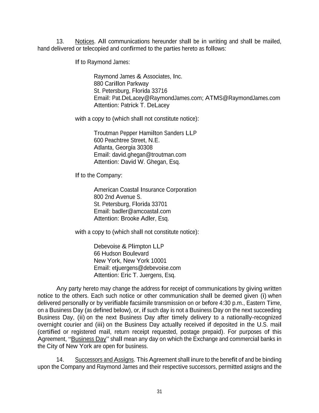 31 13. Notices. All communications hereunder shall be in writing and shall be mailed, hand delivered or telecopied and confirmed to the parties hereto as follows: If to Raymond James: Raymond James & Associates, Inc. 880 Carillon Parkway St. Petersburg, Florida 33716 Email: Pat.DeLacey@RaymondJames.com; ATMS@RaymondJames.com Attention: Patrick T. DeLacey with a copy to (which shall not constitute notice): Troutman Pepper Hamilton Sanders LLP 600 Peachtree Street, N.E. Atlanta, Georgia 30308 Email: david.ghegan@troutman.com Attention: David W. Ghegan, Esq. If to the Company: American Coastal Insurance Corporation 800 2nd Avenue S. St. Petersburg, Florida 33701 Email: badler@amcoastal.com Attention: Brooke Adler, Esq. with a copy to (which shall not constitute notice): Debevoise & Plimpton LLP 66 Hudson Boulevard New York, New York 10001 Email: etjuergens@debevoise.com Attention: Eric T. Juergens, Esq. Any party hereto may change the address for receipt of communications by giving written notice to the others. Each such notice or other communication shall be deemed given (i) when delivered personally or by verifiable facsimile transmission on or before 4:30 p.m., Eastern Time, on a Business Day (as defined below), or, if such day is not a Business Day on the next succeeding Business Day, (ii) on the next Business Day after timely delivery to a nationally-recognized overnight courier and (iii) on the Business Day actually received if deposited in the U.S. mail (certified or registered mail, return receipt requested, postage prepaid). For purposes of this Agreement, “Business Day” shall mean any day on which the Exchange and commercial banks in the City of New York are open for business. 14. Successors and Assigns. This Agreement shall inure to the benefit of and be binding upon the Company and Raymond James and their respective successors, permitted assigns and the