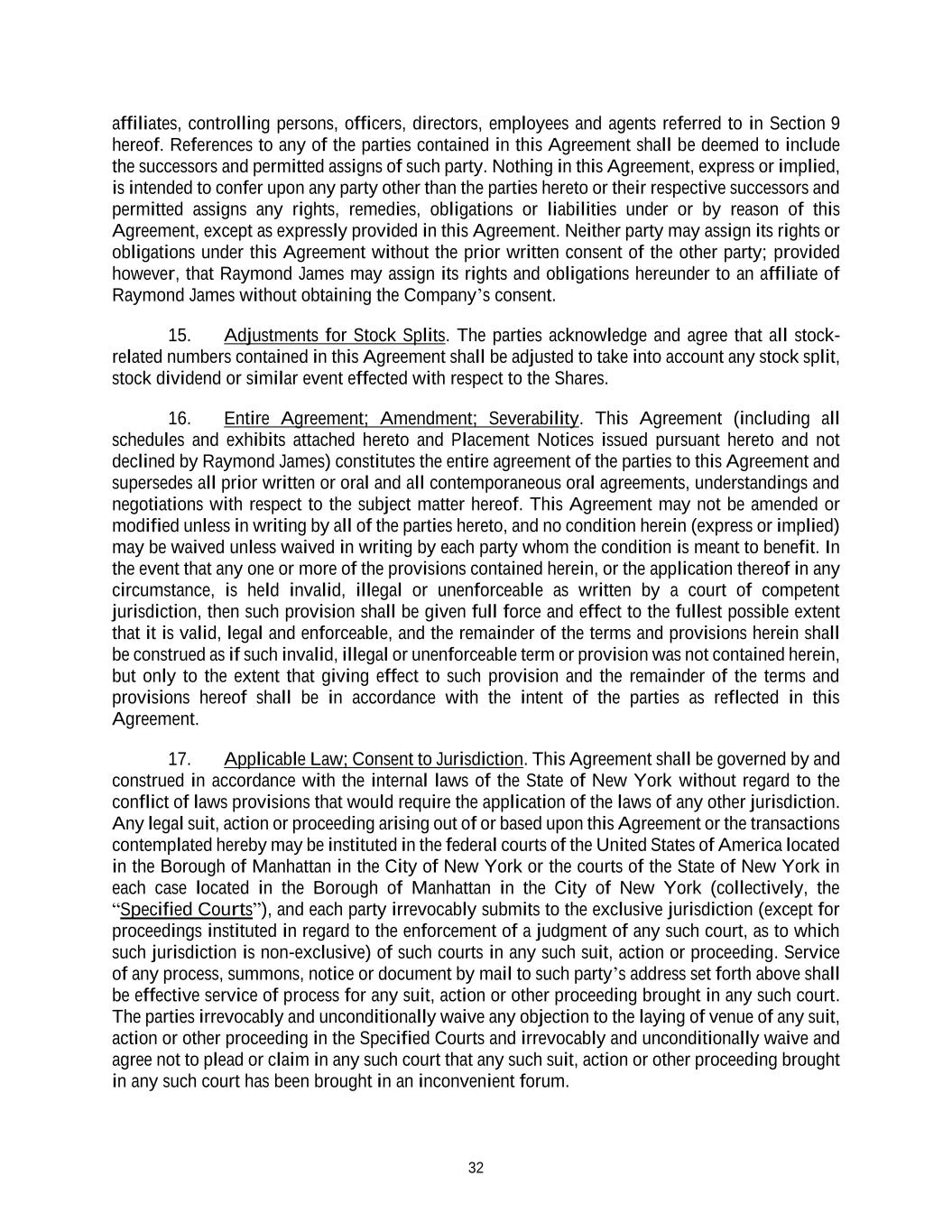 32 affiliates, controlling persons, officers, directors, employees and agents referred to in Section 9 hereof. References to any of the parties contained in this Agreement shall be deemed to include the successors and permitted assigns of such party. Nothing in this Agreement, express or implied, is intended to confer upon any party other than the parties hereto or their respective successors and permitted assigns any rights, remedies, obligations or liabilities under or by reason of this Agreement, except as expressly provided in this Agreement. Neither party may assign its rights or obligations under this Agreement without the prior written consent of the other party; provided however, that Raymond James may assign its rights and obligations hereunder to an affiliate of Raymond James without obtaining the Company’s consent. 15. Adjustments for Stock Splits. The parties acknowledge and agree that all stock- related numbers contained in this Agreement shall be adjusted to take into account any stock split, stock dividend or similar event effected with respect to the Shares. 16. Entire Agreement; Amendment; Severability. This Agreement (including all schedules and exhibits attached hereto and Placement Notices issued pursuant hereto and not declined by Raymond James) constitutes the entire agreement of the parties to this Agreement and supersedes all prior written or oral and all contemporaneous oral agreements, understandings and negotiations with respect to the subject matter hereof. This Agreement may not be amended or modified unless in writing by all of the parties hereto, and no condition herein (express or implied) may be waived unless waived in writing by each party whom the condition is meant to benefit. In the event that any one or more of the provisions contained herein, or the application thereof in any circumstance, is held invalid, illegal or unenforceable as written by a court of competent jurisdiction, then such provision shall be given full force and effect to the fullest possible extent that it is valid, legal and enforceable, and the remainder of the terms and provisions herein shall be construed as if such invalid, illegal or unenforceable term or provision was not contained herein, but only to the extent that giving effect to such provision and the remainder of the terms and provisions hereof shall be in accordance with the intent of the parties as reflected in this Agreement. 17. Applicable Law; Consent to Jurisdiction. This Agreement shall be governed by and construed in accordance with the internal laws of the State of New York without regard to the conflict of laws provisions that would require the application of the laws of any other jurisdiction. Any legal suit, action or proceeding arising out of or based upon this Agreement or the transactions contemplated hereby may be instituted in the federal courts of the United States of America located in the Borough of Manhattan in the City of New York or the courts of the State of New York in each case located in the Borough of Manhattan in the City of New York (collectively, the “Specified Courts”), and each party irrevocably submits to the exclusive jurisdiction (except for proceedings instituted in regard to the enforcement of a judgment of any such court, as to which such jurisdiction is non-exclusive) of such courts in any such suit, action or proceeding. Service of any process, summons, notice or document by mail to such party’s address set forth above shall be effective service of process for any suit, action or other proceeding brought in any such court. The parties irrevocably and unconditionally waive any objection to the laying of venue of any suit, action or other proceeding in the Specified Courts and irrevocably and unconditionally waive and agree not to plead or claim in any such court that any such suit, action or other proceeding brought in any such court has been brought in an inconvenient forum.