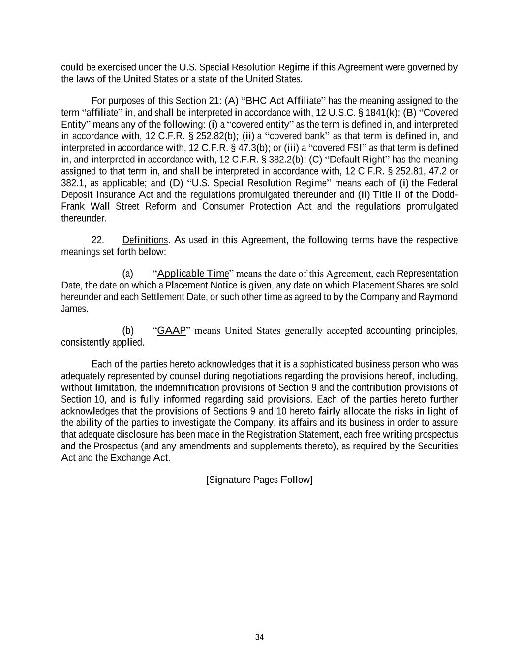 34 could be exercised under the U.S. Special Resolution Regime if this Agreement were governed by the laws of the United States or a state of the United States. For purposes of this Section 21: (A) “BHC Act Affiliate” has the meaning assigned to the term “affiliate” in, and shall be interpreted in accordance with, 12 U.S.C. § 1841(k); (B) “Covered Entity” means any of the following: (i) a “covered entity” as the term is defined in, and interpreted in accordance with, 12 C.F.R. § 252.82(b); (ii) a “covered bank” as that term is defined in, and interpreted in accordance with, 12 C.F.R. § 47.3(b); or (iii) a “covered FSI” as that term is defined in, and interpreted in accordance with, 12 C.F.R. § 382.2(b); (C) “Default Right” has the meaning assigned to that term in, and shall be interpreted in accordance with, 12 C.F.R. § 252.81, 47.2 or 382.1, as applicable; and (D) “U.S. Special Resolution Regime” means each of (i) the Federal Deposit Insurance Act and the regulations promulgated thereunder and (ii) Title II of the Dodd- Frank Wall Street Reform and Consumer Protection Act and the regulations promulgated thereunder. 22. Definitions. As used in this Agreement, the following terms have the respective meanings set forth below: (a) “Applicable Time” means the date of this Agreement, each Representation Date, the date on which a Placement Notice is given, any date on which Placement Shares are sold hereunder and each Settlement Date, or such other time as agreed to by the Company and Raymond James. (b) “GAAP” means United States generally accepted accounting principles, consistently applied. Each of the parties hereto acknowledges that it is a sophisticated business person who was adequately represented by counsel during negotiations regarding the provisions hereof, including, without limitation, the indemnification provisions of Section 9 and the contribution provisions of Section 10, and is fully informed regarding said provisions. Each of the parties hereto further acknowledges that the provisions of Sections 9 and 10 hereto fairly allocate the risks in light of the ability of the parties to investigate the Company, its affairs and its business in order to assure that adequate disclosure has been made in the Registration Statement, each free writing prospectus and the Prospectus (and any amendments and supplements thereto), as required by the Securities Act and the Exchange Act. [Signature Pages Follow]