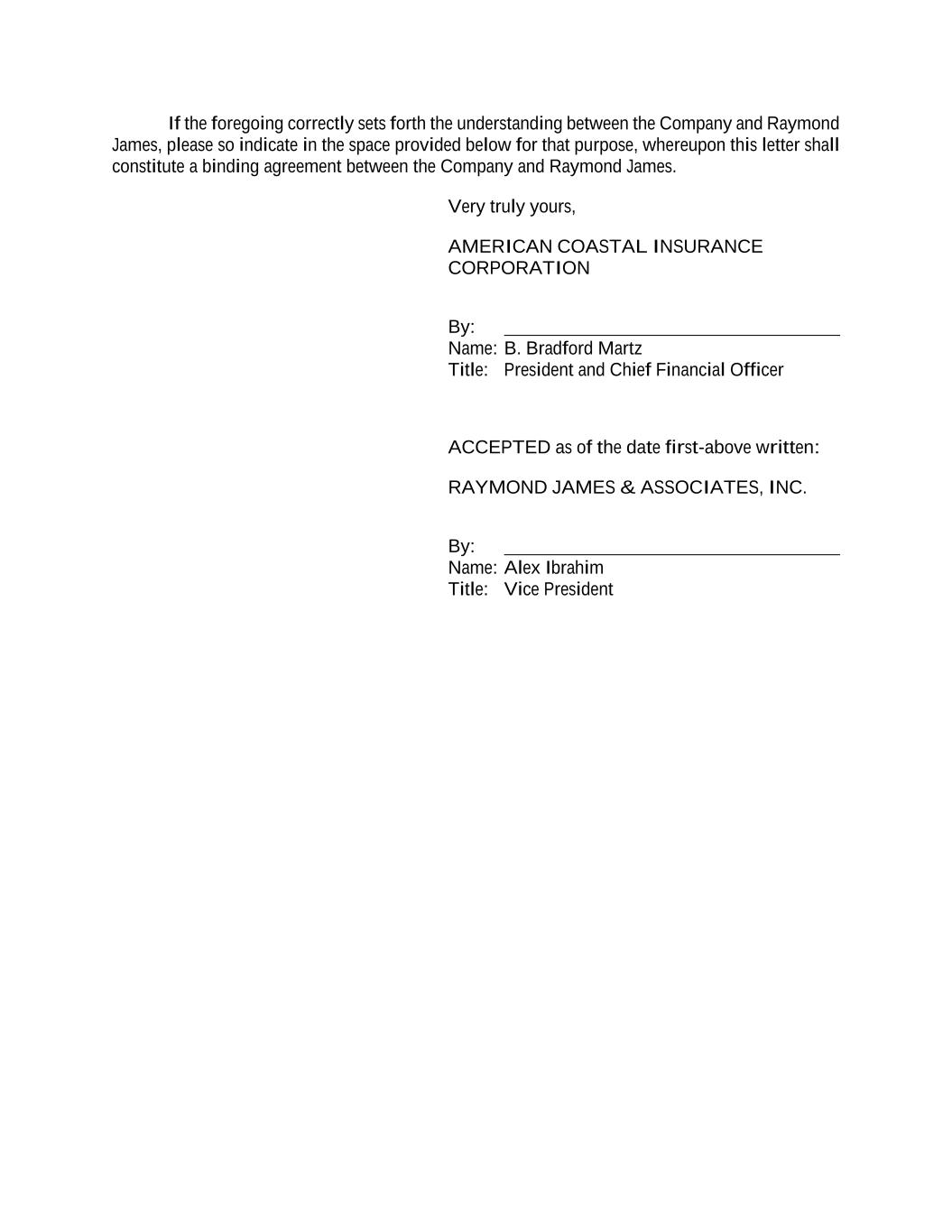 If the foregoing correctly sets forth the understanding between the Company and Raymond James, please so indicate in the space provided below for that purpose, whereupon this letter shall constitute a binding agreement between the Company and Raymond James. Very truly yours, AMERICAN COASTAL INSURANCE CORPORATION By: Name: B. Bradford Martz Title: President and Chief Financial Officer ACCEPTED as of the date first-above written: RAYMOND JAMES & ASSOCIATES, INC. By: Name: Alex Ibrahim Title: Vice President