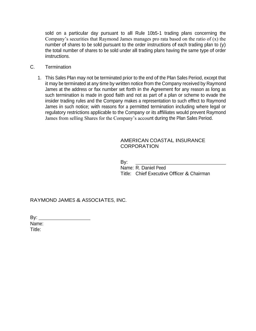 sold on a particular day pursuant to all Rule 10b5-1 trading plans concerning the Company’s securities that Raymond James manages pro rata based on the ratio of (x) the number of shares to be sold pursuant to the order instructions of each trading plan to (y) the total number of shares to be sold under all trading plans having the same type of order instructions. C. Termination 1. This Sales Plan may not be terminated prior to the end of the Plan Sales Period, except that it may be terminated at any time by written notice from the Company received by Raymond James at the address or fax number set forth in the Agreement for any reason as long as such termination is made in good faith and not as part of a plan or scheme to evade the insider trading rules and the Company makes a representation to such effect to Raymond James in such notice; with reasons for a permitted termination including where legal or regulatory restrictions applicable to the Company or its affiliates would prevent Raymond James from selling Shares for the Company’s account during the Plan Sales Period. AMERICAN COASTAL INSURANCE CORPORATION By: Name: R. Daniel Peed Title: Chief Executive Officer & Chairman RAYMOND JAMES & ASSOCIATES, INC. By: Name: Title: