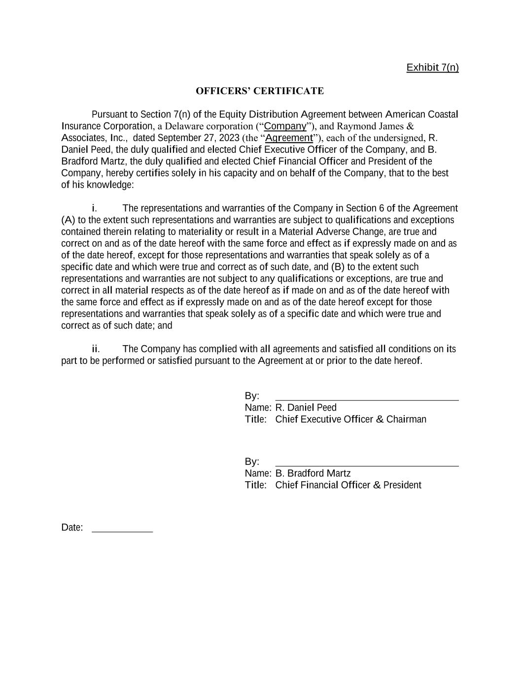 Exhibit 7(n) OFFICERS’ CERTIFICATE Pursuant to Section 7(n) of the Equity Distribution Agreement between American Coastal Insurance Corporation, a Delaware corporation (“Company”), and Raymond James & Associates, Inc., dated September 27, 2023 (the “Agreement”), each of the undersigned, R. Daniel Peed, the duly qualified and elected Chief Executive Officer of the Company, and B. Bradford Martz, the duly qualified and elected Chief Financial Officer and President of the Company, hereby certifies solely in his capacity and on behalf of the Company, that to the best of his knowledge: i. The representations and warranties of the Company in Section 6 of the Agreement (A) to the extent such representations and warranties are subject to qualifications and exceptions contained therein relating to materiality or result in a Material Adverse Change, are true and correct on and as of the date hereof with the same force and effect as if expressly made on and as of the date hereof, except for those representations and warranties that speak solely as of a specific date and which were true and correct as of such date, and (B) to the extent such representations and warranties are not subject to any qualifications or exceptions, are true and correct in all material respects as of the date hereof as if made on and as of the date hereof with the same force and effect as if expressly made on and as of the date hereof except for those representations and warranties that speak solely as of a specific date and which were true and correct as of such date; and ii. The Company has complied with all agreements and satisfied all conditions on its part to be performed or satisfied pursuant to the Agreement at or prior to the date hereof. By: Name: R. Daniel Peed Title: Chief Executive Officer & Chairman By: Name: B. Bradford Martz Title: Chief Financial Officer & President Date: