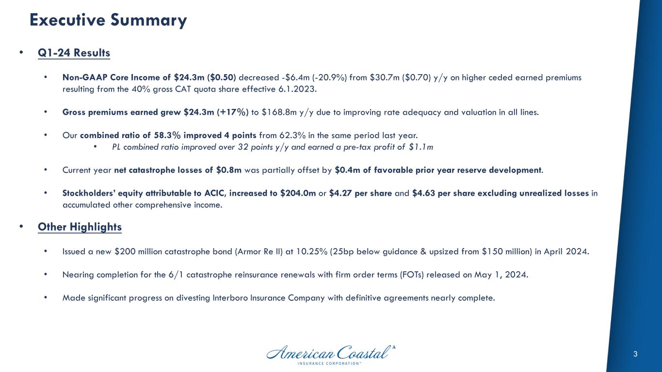 2 Company Overview ACIC is a specialty underwriter of catastrophe exposed property insurance. American Coastal Insurance Corp. (Nasdaq: ACIC) is the insurance holding company for two P&C carriers: American Coastal Insurance Company (AmCoastal) and Interboro Insurance Company (IIC) ¹ along with other operating affiliates. AmCoastal has the #1 market share of commercial residential property insurance (commercial lines) in Florida with roughly 4,100 policies and $652 million of premium in-force. IIC’s homeowners & fire insurance products (personal lines) are written exclusively in New York with approximately 18,640 policies and $36 million of premium in-force. ¹ ACIC as of March 31, 2024 Total Assets: $1.08 billion Total Equity: $204 million Annualized Revenue: $293 million Employees: 70 Headquarters: St. Petersburg, FL Credit Rating: BB+ (Kroll) Specialty Commercial Property Specialty Homeowners ¹ ¹ ACIC previously disclosed its strategic intent to divest of IIC and exit personal lines.
