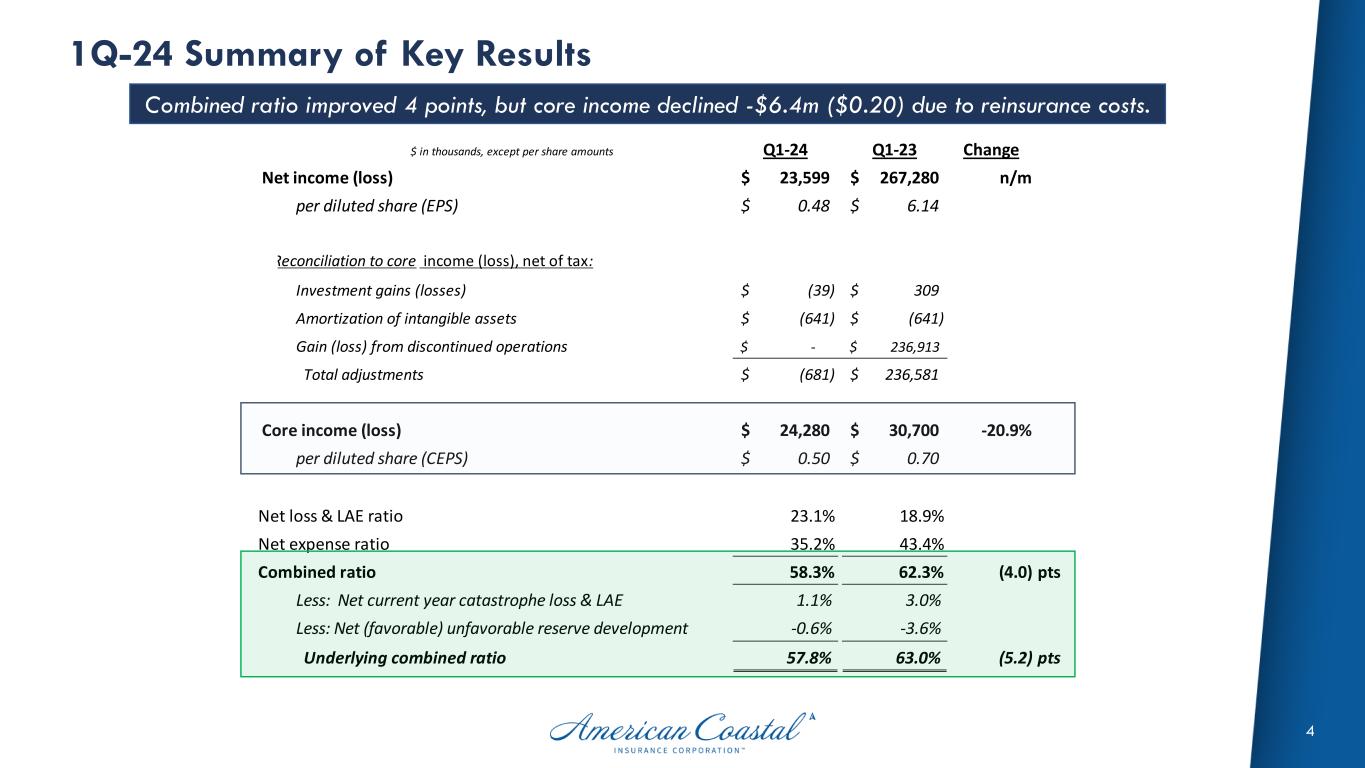 3 Executive Summary • Q1-24 Results • Non-GAAP Core Income of $24.3m ($0.50) decreased -$6.4m (-20.9%) from $30.7m ($0.70) y/y on higher ceded earned premiums resulting from the 40% gross CAT quota share effective 6.1.2023. • Gross premiums earned grew $24.3m (+17%) to $168.8m y/y due to improving rate adequacy and valuation in all lines. • Our combined ratio of 58.3% improved 4 points from 62.3% in the same period last year. • PL combined ratio improved over 32 points y/y and earned a pre-tax profit of $1.1m • Current year net catastrophe losses of $0.8m was partially offset by $0.4m of favorable prior year reserve development. • Stockholders’ equity attributable to ACIC, increased to $204.0m or $4.27 per share and $4.63 per share excluding unrealized losses in accumulated other comprehensive income. • Other Highlights • Issued a new $200 million catastrophe bond (Armor Re II) at 10.25% (25bp below guidance & upsized from $150 million) in April 2024. • Nearing completion for the 6/1 catastrophe reinsurance renewals with firm order terms (FOTs) released on May 1, 2024. • Made significant progress on divesting Interboro Insurance Company with definitive agreements nearly complete.