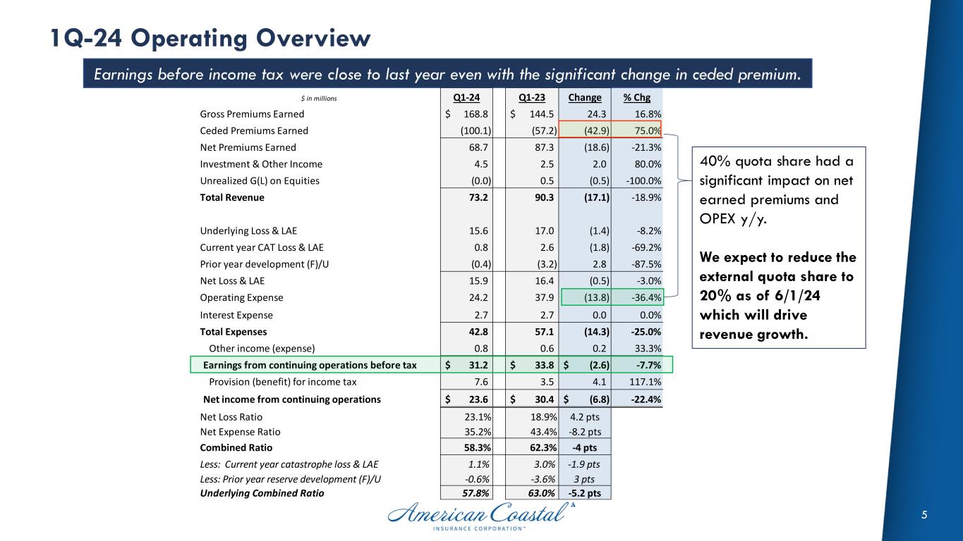 4 1Q-24 Summary of Key Results Combined ratio improved 4 points, but core income declined -$6.4m ($0.20) due to reinsurance costs. $ in thousands, except per share amounts Q1-24 Q1-23 Change Net income (loss) 23,599$ 267,280$ n/m per diluted share (EPS) 0.48$ 6.14$ Reconciliation to core income (loss), net of tax: Investment gains (losses) (39)$ 309$ Amortization of intangible assets (641)$ (641)$ Gain (loss) from discontinued operations -$ 236,913$ Total adjustments (681)$ 236,581$ Core income (loss) 24,280$ 30,700$ -20.9% per diluted share (CEPS) 0.50$ 0.70$ Net loss & LAE ratio 23.1% 18.9% Net expense ratio 35.2% 43.4% Combined ratio 58.3% 62.3% (4.0) pts Less: Net current year catastrophe loss & LAE 1.1% 3.0% Less: Net (favorable) unfavorable reserve development -0.6% -3.6% Underlying combined ratio 57.8% 63.0% (5.2) pts