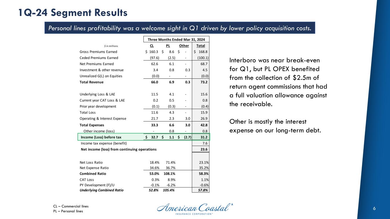 5 1Q-24 Operating Overview Earnings before income tax were close to last year even with the significant change in ceded premium. 40% quota share had a significant impact on net earned premiums and OPEX y/y. We expect to reduce the external quota share to 20% as of 6/1/24 which will drive revenue growth. $ in millions Q1-24 Q1-23 Change % Chg Gross Premiums Earned 168.8$ 144.5$ 24.3 16.8% Ceded Premiums Earned (100.1) (57.2) (42.9) 75.0% Net Premiums Earned 68.7 87.3 (18.6) -21.3% Investment & Other Income 4.5 2.5 2.0 80.0% Unrealized G(L) on Equities (0.0) 0.5 (0.5) -100.0% Total Revenue 73.2 90.3 (17.1) -18.9% Underlying Loss & LAE 15.6 17.0 (1.4) -8.2% Current year CAT Loss & LAE 0.8 2.6 (1.8) -69.2% Prior year development (F)/U (0.4) (3.2) 2.8 -87.5% Net Loss & LAE 15.9 16.4 (0.5) -3.0% Operating Expense 24.2 37.9 (13.8) -36.4% Interest Expense 2.7 2.7 0.0 0.0% Total Expenses 42.8 57.1 (14.3) -25.0% Other income (expense) 0.8 0.6 0.2 33.3% Earnings from continuing operations before tax 31.2$ 33.8$ (2.6)$ -7.7% Provision (benefit) for income tax 7.6 3.5 4.1 117.1% Net income from continuing operations 23.6$ 30.4$ (6.8)$ -22.4% Net Loss Ratio 23.1% 18.9% 4.2 pts Net Expense Ratio 35.2% 43.4% -8.2 pts Combined Ratio 58.3% 62.3% -4 pts Less: Current year catastrophe loss & LAE 1.1% 3.0% -1.9 pts Less: Prior year reserve development (F)/U -0.6% -3.6% 3 pts Underlying Combined Ratio 57.8% 63.0% -5.2 pts