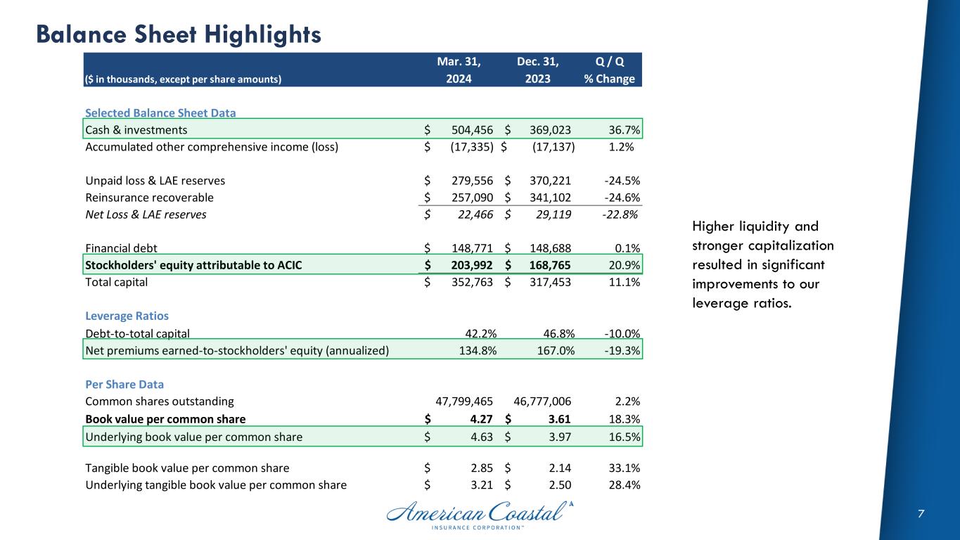 6 1Q-24 Segment Results Personal lines profitability was a welcome sight in Q1 driven by lower policy acquisition costs. CL – Commercial lines PL – Personal lines Interboro was near break-even for Q1, but PL OPEX benefited from the collection of $2.5m of return agent commissions that had a full valuation allowance against the receivable. Other is mostly the interest expense on our long-term debt. $ in millions CL PL Other Total Gross Premiums Earned 160.3$ 8.6$ -$ 168.8$ Ceded Premiums Earned (97.6) (2.5) - (100.1) Net Premiums Earned 62.6 6.1 - 68.7 Investment & other revenue 3.4 0.8 0.3 4.5 Unrealized G(L) on Equities (0.0) - - (0.0) Total Revenue 66.0 6.9 0.3 73.2 Underlying Loss & LAE 11.5 4.1 - 15.6 Current year CAT Loss & LAE 0.2 0.5 - 0.8 Prior year development (0.1) (0.3) - (0.4) Total Loss 11.6 4.3 - 15.9 Operating & Interest Expense 21.7 2.3 3.0 26.9 Total Expenses 33.3 6.6 3.0 42.8 Other income (loss) - 0.8 - 0.8 Income (Loss) before tax 32.7$ 1.1$ (2.7)$ 31.2 Income tax expense (benefit) 7.6 Net income (loss) from continuing operations 23.6 Net Loss Ratio 18.4% 71.4% 23.1% Net Expense Ratio 34.6% 36.7% 35.2% Combined Ratio 53.0% 108.1% 58.3% CAT Loss 0.3% 8.9% 1.1% PY Development (F)/U -0.1% -6.2% -0.6% Underlying Combined Ratio 52.8% 105.4% 57.8% Three Months Ended Mar 31, 2024
