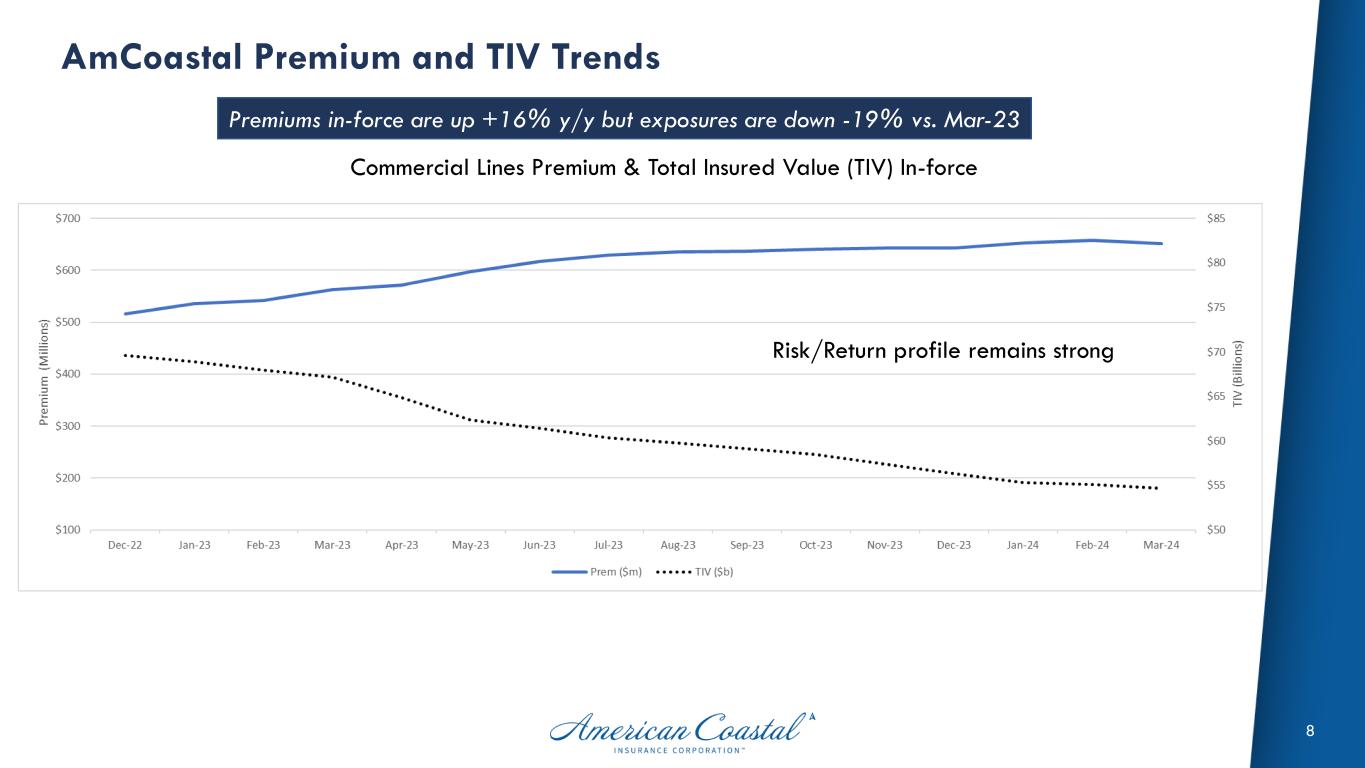 7 Balance Sheet Highlights Higher liquidity and stronger capitalization resulted in significant improvements to our leverage ratios. Mar. 31, Dec. 31, Q / Q ($ in thousands, except per share amounts) 2024 2023 % Change Selected Balance Sheet Data Cash & investments 504,456$ 369,023$ 36.7% Accumulated other comprehensive income (loss) $ (17,137) (17,335) $ 1.2% Unpaid loss & LAE reserves 279,556$ 370,221$ -24.5% Reinsurance recoverable 257,090$ 341,102$ -24.6% Net Loss & LAE reserves 22,466$ 29,119$ -22.8% Financial debt 148,771$ 148,688$ 0.1% Stockholders' equity attributable to ACIC 203,992$ 168,765$ 20.9% Total capital 352,763$ 317,453$ 11.1% Leverage Ratios Debt-to-total capital 42.2% 46.8% -10.0% Net premiums earned-to-stockholders' equity (annualized) 134.8% 167.0% -19.3% Per Share Data Common shares outstanding 47,799,465 46,777,006 2.2% Book value per common share 4.27$ 3.61$ 18.3% Underlying book value per common share 4.63$ 3.97$ 16.5% Tangible book value per common share 2.85$ 2.14$ 33.1% Underlying tangible book value per common share 3.21$ 2.50$ 28.4%