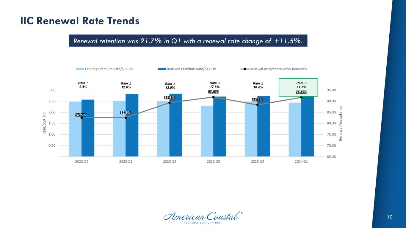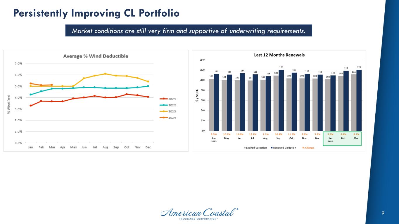 AmCoastal Premium and TIV Trends 8 Premiums in-force are up +16% y/y but exposures are down -19% vs. Mar-23 Commercial Lines Premium & Total Insured Value (TIV) In-force Risk/Return profile remains strong