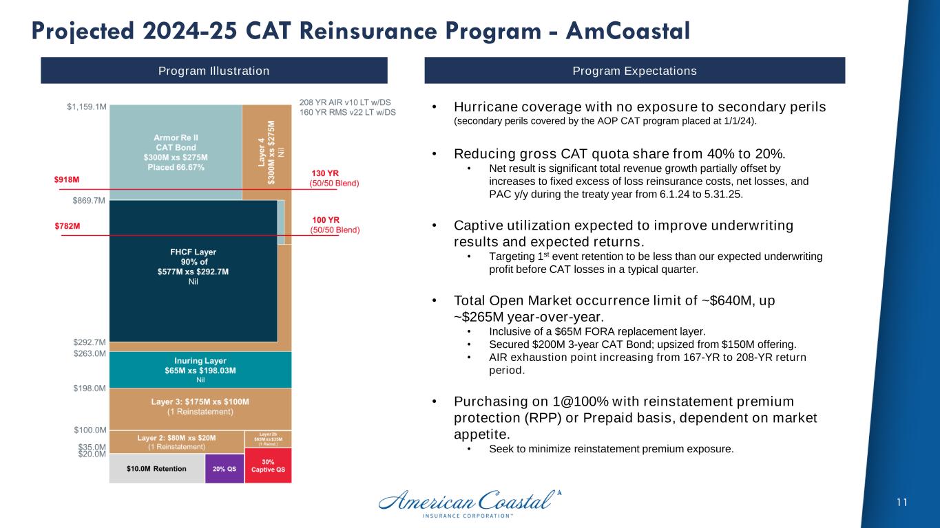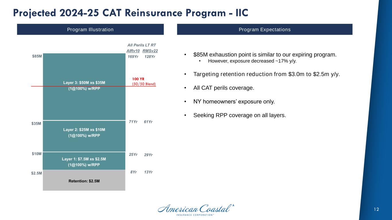 11 Projected 2024-25 CAT Reinsurance Program - AmCoastal Program Illustration Program Expectations • Hurricane coverage with no exposure to secondary perils (secondary perils covered by the AOP CAT program placed at 1/1/24). • Reducing gross CAT quota share from 40% to 20%. • Net result is significant total revenue growth partially offset by increases to fixed excess of loss reinsurance costs, net losses, and PAC y/y during the treaty year from 6.1.24 to 5.31.25. • Captive utilization expected to improve underwriting results and expected returns. • Targeting 1st event retention to be less than our expected underwriting profit before CAT losses in a typical quarter. • Total Open Market occurrence limit of ~$640M, up ~$265M year-over-year. • Inclusive of a $65M FORA replacement layer. • Secured $200M 3-year CAT Bond; upsized from $150M offering. • AIR exhaustion point increasing from 167-YR to 208-YR return period. • Purchasing on 1@100% with reinstatement premium protection (RPP) or Prepaid basis, dependent on market appetite. • Seek to minimize reinstatement premium exposure.