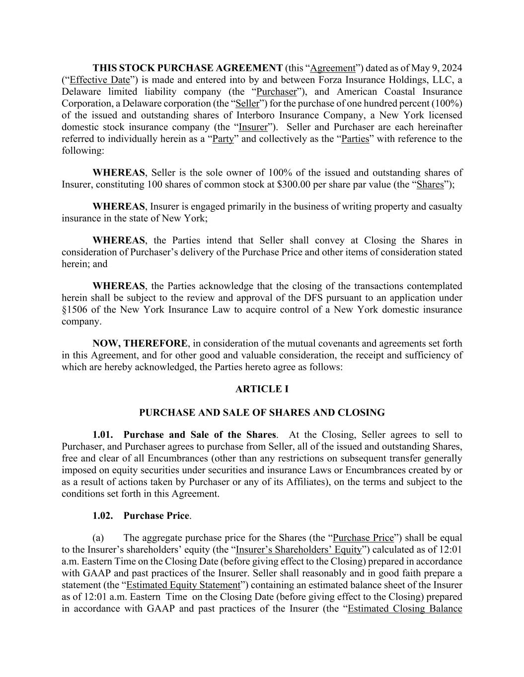 THIS STOCK PURCHASE AGREEMENT (this “Agreement”) dated as of May 9, 2024 (“Effective Date”) is made and entered into by and between Forza Insurance Holdings, LLC, a Delaware limited liability company (the “Purchaser”), and American Coastal Insurance Corporation, a Delaware corporation (the “Seller”) for the purchase of one hundred percent (100%) of the issued and outstanding shares of Interboro Insurance Company, a New York licensed domestic stock insurance company (the “Insurer”). Seller and Purchaser are each hereinafter referred to individually herein as a “Party” and collectively as the “Parties” with reference to the following: WHEREAS, Seller is the sole owner of 100% of the issued and outstanding shares of Insurer, constituting 100 shares of common stock at $300.00 per share par value (the “Shares”); WHEREAS, Insurer is engaged primarily in the business of writing property and casualty insurance in the state of New York; WHEREAS, the Parties intend that Seller shall convey at Closing the Shares in consideration of Purchaser’s delivery of the Purchase Price and other items of consideration stated herein; and WHEREAS, the Parties acknowledge that the closing of the transactions contemplated herein shall be subject to the review and approval of the DFS pursuant to an application under §1506 of the New York Insurance Law to acquire control of a New York domestic insurance company. NOW, THEREFORE, in consideration of the mutual covenants and agreements set forth in this Agreement, and for other good and valuable consideration, the receipt and sufficiency of which are hereby acknowledged, the Parties hereto agree as follows: ARTICLE I PURCHASE AND SALE OF SHARES AND CLOSING 1.01. Purchase and Sale of the Shares. At the Closing, Seller agrees to sell to Purchaser, and Purchaser agrees to purchase from Seller, all of the issued and outstanding Shares, free and clear of all Encumbrances (other than any restrictions on subsequent transfer generally imposed on equity securities under securities and insurance Laws or Encumbrances created by or as a result of actions taken by Purchaser or any of its Affiliates), on the terms and subject to the conditions set forth in this Agreement. 1.02. Purchase Price. (a) The aggregate purchase price for the Shares (the “Purchase Price”) shall be equal to the Insurer’s shareholders’ equity (the “Insurer’s Shareholders’ Equity”) calculated as of 12:01 a.m. Eastern Time on the Closing Date (before giving effect to the Closing) prepared in accordance with GAAP and past practices of the Insurer. Seller shall reasonably and in good faith prepare a statement (the “Estimated Equity Statement”) containing an estimated balance sheet of the Insurer as of 12:01 a.m. Eastern Time on the Closing Date (before giving effect to the Closing) prepared in accordance with GAAP and past practices of the Insurer (the “Estimated Closing Balance
