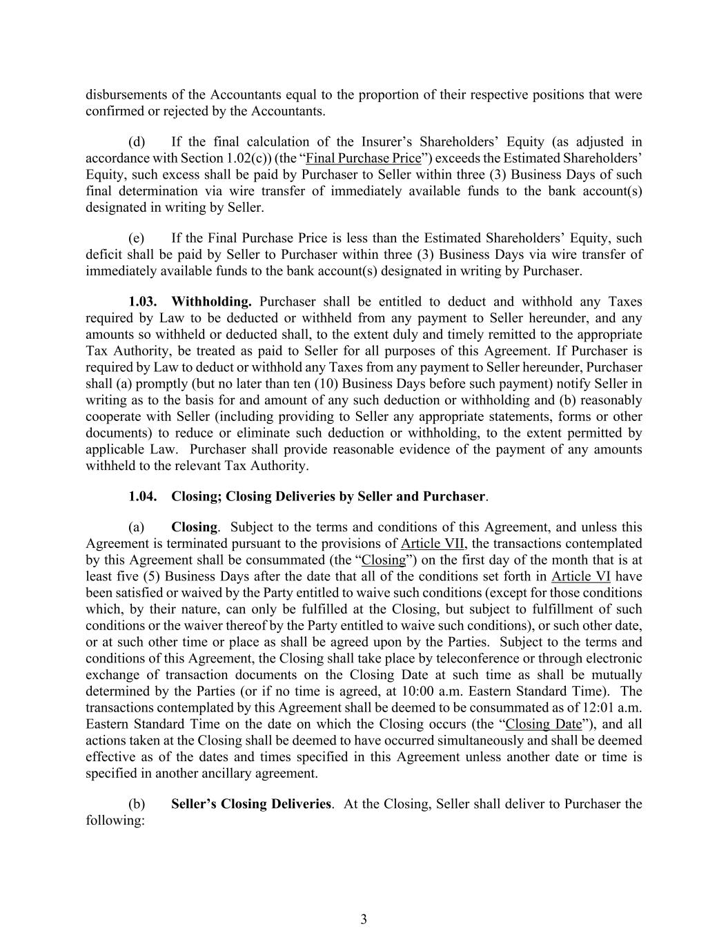 3 disbursements of the Accountants equal to the proportion of their respective positions that were confirmed or rejected by the Accountants. (d) If the final calculation of the Insurer’s Shareholders’ Equity (as adjusted in accordance with Section 1.02(c)) (the “Final Purchase Price”) exceeds the Estimated Shareholders’ Equity, such excess shall be paid by Purchaser to Seller within three (3) Business Days of such final determination via wire transfer of immediately available funds to the bank account(s) designated in writing by Seller. (e) If the Final Purchase Price is less than the Estimated Shareholders’ Equity, such deficit shall be paid by Seller to Purchaser within three (3) Business Days via wire transfer of immediately available funds to the bank account(s) designated in writing by Purchaser. 1.03. Withholding. Purchaser shall be entitled to deduct and withhold any Taxes required by Law to be deducted or withheld from any payment to Seller hereunder, and any amounts so withheld or deducted shall, to the extent duly and timely remitted to the appropriate Tax Authority, be treated as paid to Seller for all purposes of this Agreement. If Purchaser is required by Law to deduct or withhold any Taxes from any payment to Seller hereunder, Purchaser shall (a) promptly (but no later than ten (10) Business Days before such payment) notify Seller in writing as to the basis for and amount of any such deduction or withholding and (b) reasonably cooperate with Seller (including providing to Seller any appropriate statements, forms or other documents) to reduce or eliminate such deduction or withholding, to the extent permitted by applicable Law. Purchaser shall provide reasonable evidence of the payment of any amounts withheld to the relevant Tax Authority. 1.04. Closing; Closing Deliveries by Seller and Purchaser. (a) Closing. Subject to the terms and conditions of this Agreement, and unless this Agreement is terminated pursuant to the provisions of Article VII, the transactions contemplated by this Agreement shall be consummated (the “Closing”) on the first day of the month that is at least five (5) Business Days after the date that all of the conditions set forth in Article VI have been satisfied or waived by the Party entitled to waive such conditions (except for those conditions which, by their nature, can only be fulfilled at the Closing, but subject to fulfillment of such conditions or the waiver thereof by the Party entitled to waive such conditions), or such other date, or at such other time or place as shall be agreed upon by the Parties. Subject to the terms and conditions of this Agreement, the Closing shall take place by teleconference or through electronic exchange of transaction documents on the Closing Date at such time as shall be mutually determined by the Parties (or if no time is agreed, at 10:00 a.m. Eastern Standard Time). The transactions contemplated by this Agreement shall be deemed to be consummated as of 12:01 a.m. Eastern Standard Time on the date on which the Closing occurs (the “Closing Date”), and all actions taken at the Closing shall be deemed to have occurred simultaneously and shall be deemed effective as of the dates and times specified in this Agreement unless another date or time is specified in another ancillary agreement. (b) Seller’s Closing Deliveries. At the Closing, Seller shall deliver to Purchaser the following: