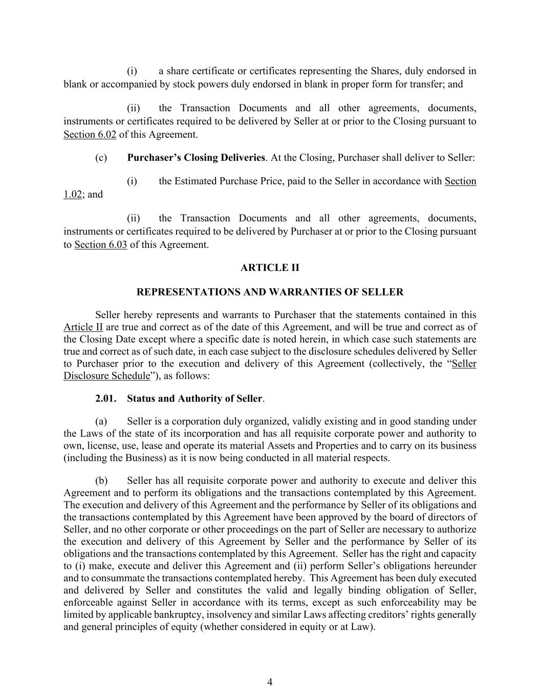 4 (i) a share certificate or certificates representing the Shares, duly endorsed in blank or accompanied by stock powers duly endorsed in blank in proper form for transfer; and (ii) the Transaction Documents and all other agreements, documents, instruments or certificates required to be delivered by Seller at or prior to the Closing pursuant to Section 6.02 of this Agreement. (c) Purchaser’s Closing Deliveries. At the Closing, Purchaser shall deliver to Seller: (i) the Estimated Purchase Price, paid to the Seller in accordance with Section 1.02; and (ii) the Transaction Documents and all other agreements, documents, instruments or certificates required to be delivered by Purchaser at or prior to the Closing pursuant to Section 6.03 of this Agreement. ARTICLE II REPRESENTATIONS AND WARRANTIES OF SELLER Seller hereby represents and warrants to Purchaser that the statements contained in this Article II are true and correct as of the date of this Agreement, and will be true and correct as of the Closing Date except where a specific date is noted herein, in which case such statements are true and correct as of such date, in each case subject to the disclosure schedules delivered by Seller to Purchaser prior to the execution and delivery of this Agreement (collectively, the “Seller Disclosure Schedule”), as follows: 2.01. Status and Authority of Seller. (a) Seller is a corporation duly organized, validly existing and in good standing under the Laws of the state of its incorporation and has all requisite corporate power and authority to own, license, use, lease and operate its material Assets and Properties and to carry on its business (including the Business) as it is now being conducted in all material respects. (b) Seller has all requisite corporate power and authority to execute and deliver this Agreement and to perform its obligations and the transactions contemplated by this Agreement. The execution and delivery of this Agreement and the performance by Seller of its obligations and the transactions contemplated by this Agreement have been approved by the board of directors of Seller, and no other corporate or other proceedings on the part of Seller are necessary to authorize the execution and delivery of this Agreement by Seller and the performance by Seller of its obligations and the transactions contemplated by this Agreement. Seller has the right and capacity to (i) make, execute and deliver this Agreement and (ii) perform Seller’s obligations hereunder and to consummate the transactions contemplated hereby. This Agreement has been duly executed and delivered by Seller and constitutes the valid and legally binding obligation of Seller, enforceable against Seller in accordance with its terms, except as such enforceability may be limited by applicable bankruptcy, insolvency and similar Laws affecting creditors’ rights generally and general principles of equity (whether considered in equity or at Law).