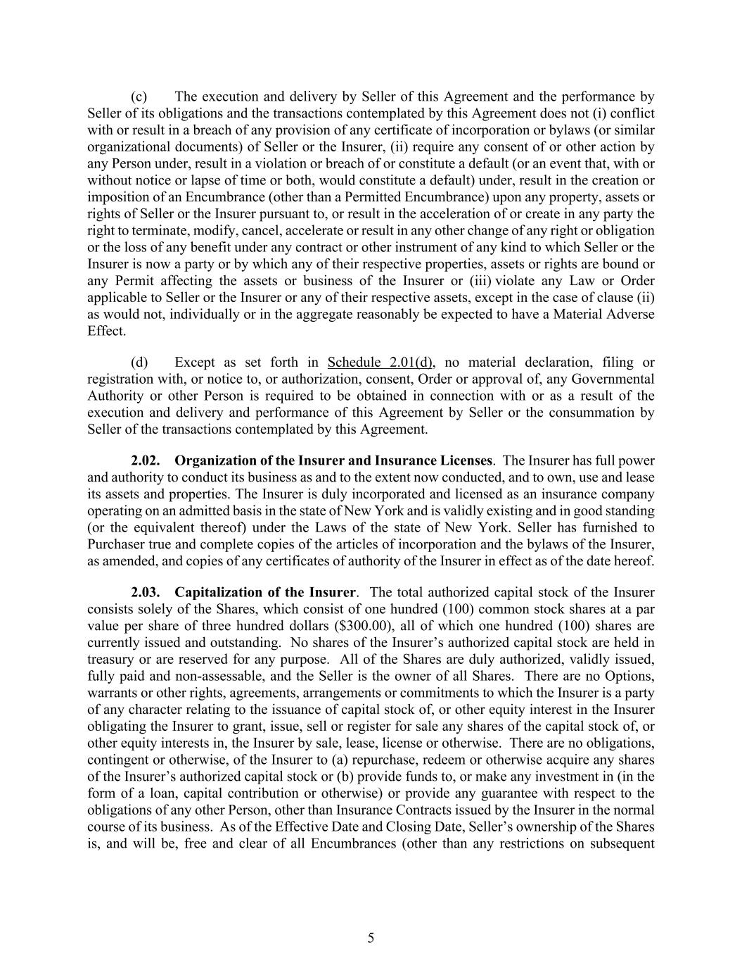 5 (c) The execution and delivery by Seller of this Agreement and the performance by Seller of its obligations and the transactions contemplated by this Agreement does not (i) conflict with or result in a breach of any provision of any certificate of incorporation or bylaws (or similar organizational documents) of Seller or the Insurer, (ii) require any consent of or other action by any Person under, result in a violation or breach of or constitute a default (or an event that, with or without notice or lapse of time or both, would constitute a default) under, result in the creation or imposition of an Encumbrance (other than a Permitted Encumbrance) upon any property, assets or rights of Seller or the Insurer pursuant to, or result in the acceleration of or create in any party the right to terminate, modify, cancel, accelerate or result in any other change of any right or obligation or the loss of any benefit under any contract or other instrument of any kind to which Seller or the Insurer is now a party or by which any of their respective properties, assets or rights are bound or any Permit affecting the assets or business of the Insurer or (iii) violate any Law or Order applicable to Seller or the Insurer or any of their respective assets, except in the case of clause (ii) as would not, individually or in the aggregate reasonably be expected to have a Material Adverse Effect. (d) Except as set forth in Schedule 2.01(d), no material declaration, filing or registration with, or notice to, or authorization, consent, Order or approval of, any Governmental Authority or other Person is required to be obtained in connection with or as a result of the execution and delivery and performance of this Agreement by Seller or the consummation by Seller of the transactions contemplated by this Agreement. 2.02. Organization of the Insurer and Insurance Licenses. The Insurer has full power and authority to conduct its business as and to the extent now conducted, and to own, use and lease its assets and properties. The Insurer is duly incorporated and licensed as an insurance company operating on an admitted basis in the state of New York and is validly existing and in good standing (or the equivalent thereof) under the Laws of the state of New York. Seller has furnished to Purchaser true and complete copies of the articles of incorporation and the bylaws of the Insurer, as amended, and copies of any certificates of authority of the Insurer in effect as of the date hereof. 2.03. Capitalization of the Insurer. The total authorized capital stock of the Insurer consists solely of the Shares, which consist of one hundred (100) common stock shares at a par value per share of three hundred dollars ($300.00), all of which one hundred (100) shares are currently issued and outstanding. No shares of the Insurer’s authorized capital stock are held in treasury or are reserved for any purpose. All of the Shares are duly authorized, validly issued, fully paid and non-assessable, and the Seller is the owner of all Shares. There are no Options, warrants or other rights, agreements, arrangements or commitments to which the Insurer is a party of any character relating to the issuance of capital stock of, or other equity interest in the Insurer obligating the Insurer to grant, issue, sell or register for sale any shares of the capital stock of, or other equity interests in, the Insurer by sale, lease, license or otherwise. There are no obligations, contingent or otherwise, of the Insurer to (a) repurchase, redeem or otherwise acquire any shares of the Insurer’s authorized capital stock or (b) provide funds to, or make any investment in (in the form of a loan, capital contribution or otherwise) or provide any guarantee with respect to the obligations of any other Person, other than Insurance Contracts issued by the Insurer in the normal course of its business. As of the Effective Date and Closing Date, Seller’s ownership of the Shares is, and will be, free and clear of all Encumbrances (other than any restrictions on subsequent