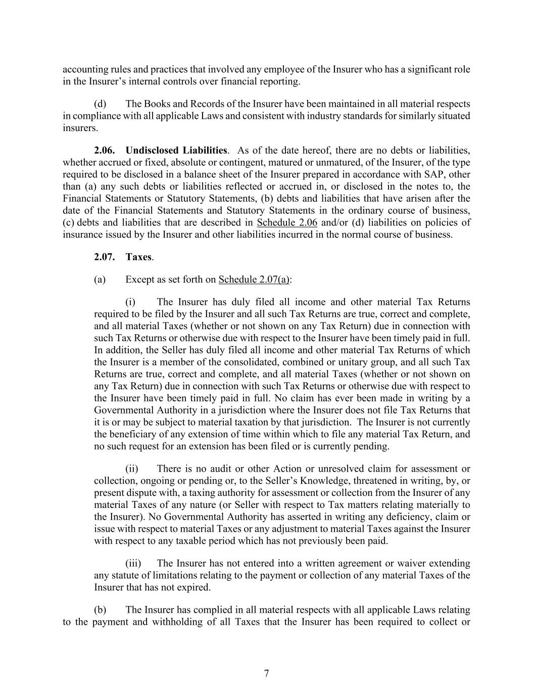 7 accounting rules and practices that involved any employee of the Insurer who has a significant role in the Insurer’s internal controls over financial reporting. (d) The Books and Records of the Insurer have been maintained in all material respects in compliance with all applicable Laws and consistent with industry standards for similarly situated insurers. 2.06. Undisclosed Liabilities. As of the date hereof, there are no debts or liabilities, whether accrued or fixed, absolute or contingent, matured or unmatured, of the Insurer, of the type required to be disclosed in a balance sheet of the Insurer prepared in accordance with SAP, other than (a) any such debts or liabilities reflected or accrued in, or disclosed in the notes to, the Financial Statements or Statutory Statements, (b) debts and liabilities that have arisen after the date of the Financial Statements and Statutory Statements in the ordinary course of business, (c) debts and liabilities that are described in Schedule 2.06 and/or (d) liabilities on policies of insurance issued by the Insurer and other liabilities incurred in the normal course of business. 2.07. Taxes. (a) Except as set forth on Schedule 2.07(a): (i) The Insurer has duly filed all income and other material Tax Returns required to be filed by the Insurer and all such Tax Returns are true, correct and complete, and all material Taxes (whether or not shown on any Tax Return) due in connection with such Tax Returns or otherwise due with respect to the Insurer have been timely paid in full. In addition, the Seller has duly filed all income and other material Tax Returns of which the Insurer is a member of the consolidated, combined or unitary group, and all such Tax Returns are true, correct and complete, and all material Taxes (whether or not shown on any Tax Return) due in connection with such Tax Returns or otherwise due with respect to the Insurer have been timely paid in full. No claim has ever been made in writing by a Governmental Authority in a jurisdiction where the Insurer does not file Tax Returns that it is or may be subject to material taxation by that jurisdiction. The Insurer is not currently the beneficiary of any extension of time within which to file any material Tax Return, and no such request for an extension has been filed or is currently pending. (ii) There is no audit or other Action or unresolved claim for assessment or collection, ongoing or pending or, to the Seller’s Knowledge, threatened in writing, by, or present dispute with, a taxing authority for assessment or collection from the Insurer of any material Taxes of any nature (or Seller with respect to Tax matters relating materially to the Insurer). No Governmental Authority has asserted in writing any deficiency, claim or issue with respect to material Taxes or any adjustment to material Taxes against the Insurer with respect to any taxable period which has not previously been paid. (iii) The Insurer has not entered into a written agreement or waiver extending any statute of limitations relating to the payment or collection of any material Taxes of the Insurer that has not expired. (b) The Insurer has complied in all material respects with all applicable Laws relating to the payment and withholding of all Taxes that the Insurer has been required to collect or