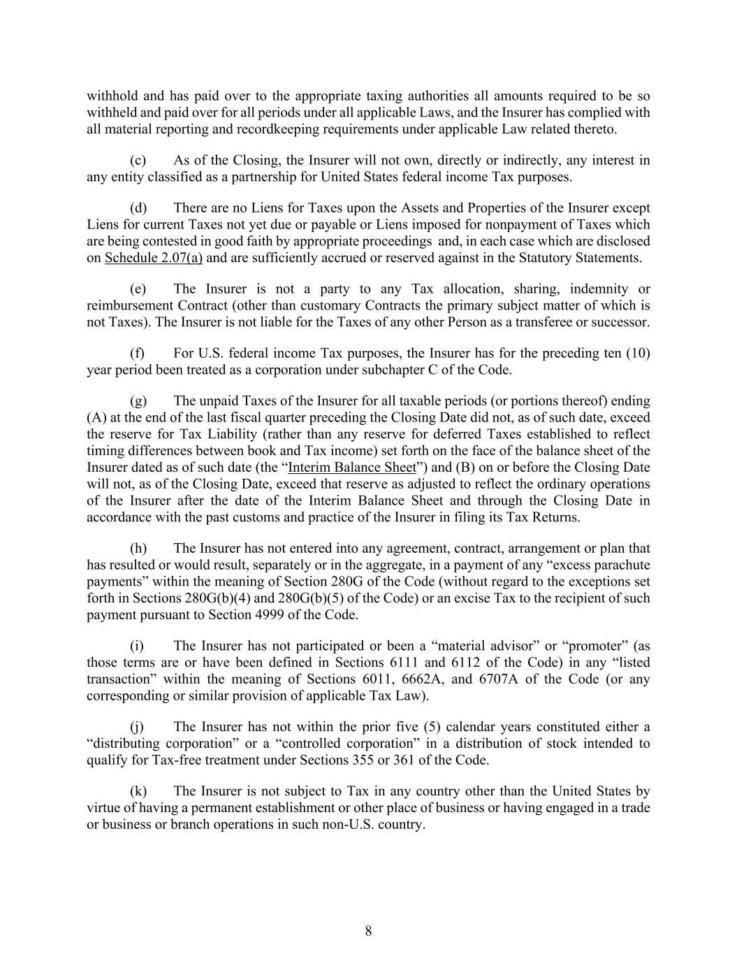 8 withhold and has paid over to the appropriate taxing authorities all amounts required to be so withheld and paid over for all periods under all applicable Laws, and the Insurer has complied with all material reporting and recordkeeping requirements under applicable Law related thereto. (c) As of the Closing, the Insurer will not own, directly or indirectly, any interest in any entity classified as a partnership for United States federal income Tax purposes. (d) There are no Liens for Taxes upon the Assets and Properties of the Insurer except Liens for current Taxes not yet due or payable or Liens imposed for nonpayment of Taxes which are being contested in good faith by appropriate proceedings and, in each case which are disclosed on Schedule 2.07(a) and are sufficiently accrued or reserved against in the Statutory Statements. (e) The Insurer is not a party to any Tax allocation, sharing, indemnity or reimbursement Contract (other than customary Contracts the primary subject matter of which is not Taxes). The Insurer is not liable for the Taxes of any other Person as a transferee or successor. (f) For U.S. federal income Tax purposes, the Insurer has for the preceding ten (10) year period been treated as a corporation under subchapter C of the Code. (g) The unpaid Taxes of the Insurer for all taxable periods (or portions thereof) ending (A) at the end of the last fiscal quarter preceding the Closing Date did not, as of such date, exceed the reserve for Tax Liability (rather than any reserve for deferred Taxes established to reflect timing differences between book and Tax income) set forth on the face of the balance sheet of the Insurer dated as of such date (the “Interim Balance Sheet”) and (B) on or before the Closing Date will not, as of the Closing Date, exceed that reserve as adjusted to reflect the ordinary operations of the Insurer after the date of the Interim Balance Sheet and through the Closing Date in accordance with the past customs and practice of the Insurer in filing its Tax Returns. (h) The Insurer has not entered into any agreement, contract, arrangement or plan that has resulted or would result, separately or in the aggregate, in a payment of any “excess parachute payments” within the meaning of Section 280G of the Code (without regard to the exceptions set forth in Sections 280G(b)(4) and 280G(b)(5) of the Code) or an excise Tax to the recipient of such payment pursuant to Section 4999 of the Code. (i) The Insurer has not participated or been a “material advisor” or “promoter” (as those terms are or have been defined in Sections 6111 and 6112 of the Code) in any “listed transaction” within the meaning of Sections 6011, 6662A, and 6707A of the Code (or any corresponding or similar provision of applicable Tax Law). (j) The Insurer has not within the prior five (5) calendar years constituted either a “distributing corporation” or a “controlled corporation” in a distribution of stock intended to qualify for Tax-free treatment under Sections 355 or 361 of the Code. (k) The Insurer is not subject to Tax in any country other than the United States by virtue of having a permanent establishment or other place of business or having engaged in a trade or business or branch operations in such non-U.S. country.