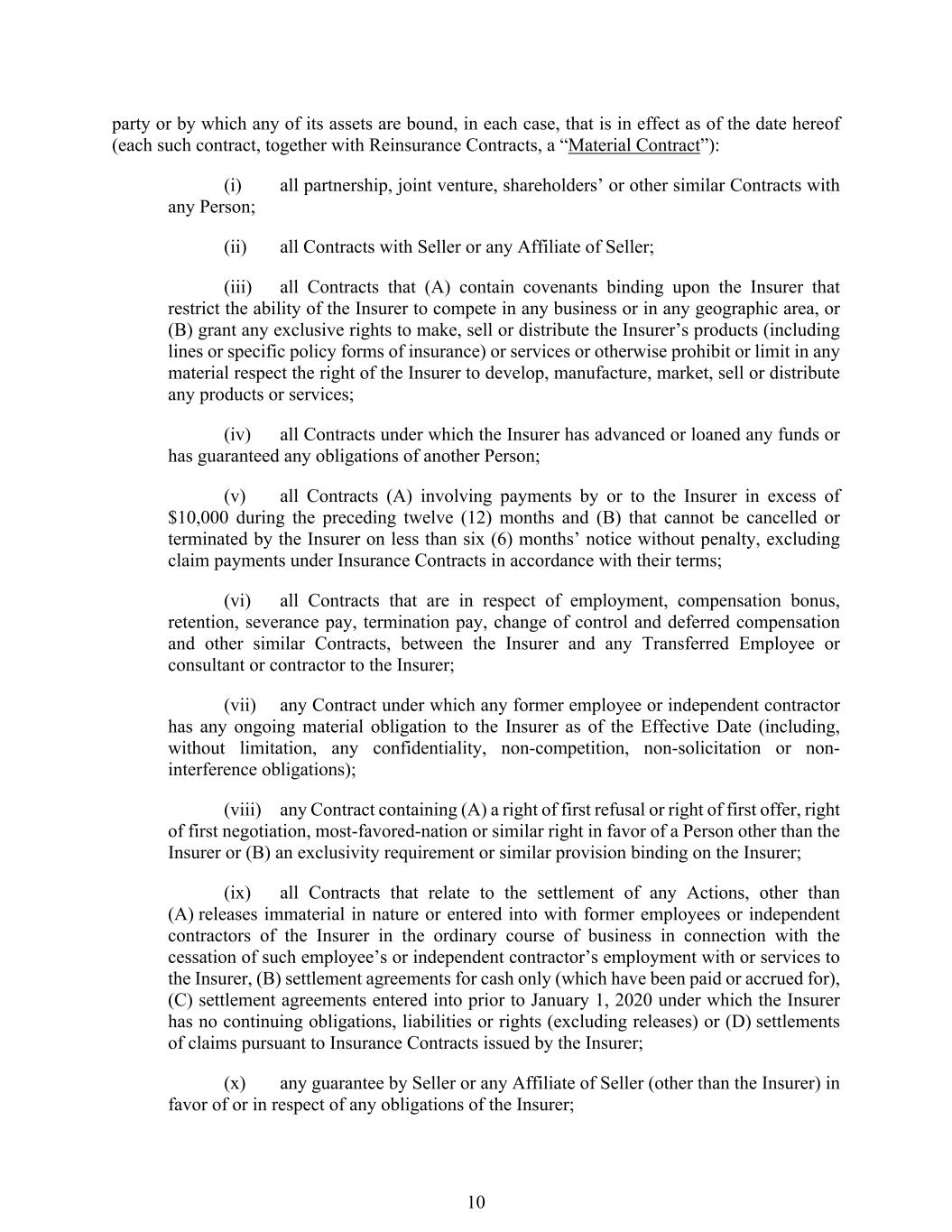 10 party or by which any of its assets are bound, in each case, that is in effect as of the date hereof (each such contract, together with Reinsurance Contracts, a “Material Contract”): (i) all partnership, joint venture, shareholders’ or other similar Contracts with any Person; (ii) all Contracts with Seller or any Affiliate of Seller; (iii) all Contracts that (A) contain covenants binding upon the Insurer that restrict the ability of the Insurer to compete in any business or in any geographic area, or (B) grant any exclusive rights to make, sell or distribute the Insurer’s products (including lines or specific policy forms of insurance) or services or otherwise prohibit or limit in any material respect the right of the Insurer to develop, manufacture, market, sell or distribute any products or services; (iv) all Contracts under which the Insurer has advanced or loaned any funds or has guaranteed any obligations of another Person; (v) all Contracts (A) involving payments by or to the Insurer in excess of $10,000 during the preceding twelve (12) months and (B) that cannot be cancelled or terminated by the Insurer on less than six (6) months’ notice without penalty, excluding claim payments under Insurance Contracts in accordance with their terms; (vi) all Contracts that are in respect of employment, compensation bonus, retention, severance pay, termination pay, change of control and deferred compensation and other similar Contracts, between the Insurer and any Transferred Employee or consultant or contractor to the Insurer; (vii) any Contract under which any former employee or independent contractor has any ongoing material obligation to the Insurer as of the Effective Date (including, without limitation, any confidentiality, non-competition, non-solicitation or non- interference obligations); (viii) any Contract containing (A) a right of first refusal or right of first offer, right of first negotiation, most-favored-nation or similar right in favor of a Person other than the Insurer or (B) an exclusivity requirement or similar provision binding on the Insurer; (ix) all Contracts that relate to the settlement of any Actions, other than (A) releases immaterial in nature or entered into with former employees or independent contractors of the Insurer in the ordinary course of business in connection with the cessation of such employee’s or independent contractor’s employment with or services to the Insurer, (B) settlement agreements for cash only (which have been paid or accrued for), (C) settlement agreements entered into prior to January 1, 2020 under which the Insurer has no continuing obligations, liabilities or rights (excluding releases) or (D) settlements of claims pursuant to Insurance Contracts issued by the Insurer; (x) any guarantee by Seller or any Affiliate of Seller (other than the Insurer) in favor of or in respect of any obligations of the Insurer;