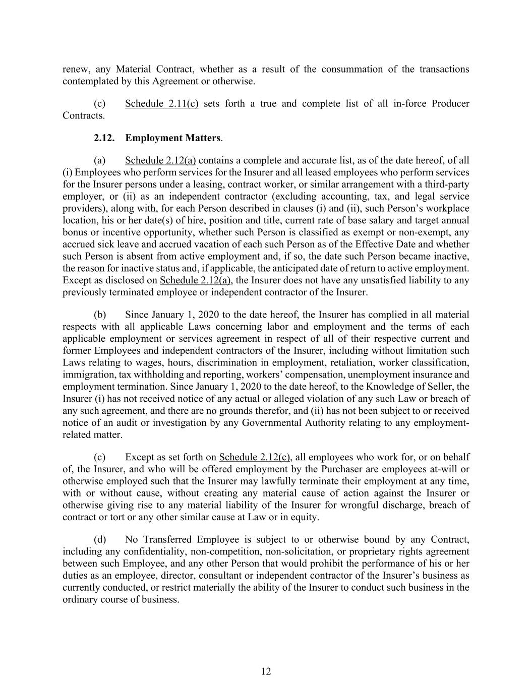 12 renew, any Material Contract, whether as a result of the consummation of the transactions contemplated by this Agreement or otherwise. (c) Schedule 2.11(c) sets forth a true and complete list of all in-force Producer Contracts. 2.12. Employment Matters. (a) Schedule 2.12(a) contains a complete and accurate list, as of the date hereof, of all (i) Employees who perform services for the Insurer and all leased employees who perform services for the Insurer persons under a leasing, contract worker, or similar arrangement with a third-party employer, or (ii) as an independent contractor (excluding accounting, tax, and legal service providers), along with, for each Person described in clauses (i) and (ii), such Person’s workplace location, his or her date(s) of hire, position and title, current rate of base salary and target annual bonus or incentive opportunity, whether such Person is classified as exempt or non-exempt, any accrued sick leave and accrued vacation of each such Person as of the Effective Date and whether such Person is absent from active employment and, if so, the date such Person became inactive, the reason for inactive status and, if applicable, the anticipated date of return to active employment. Except as disclosed on Schedule 2.12(a), the Insurer does not have any unsatisfied liability to any previously terminated employee or independent contractor of the Insurer. (b) Since January 1, 2020 to the date hereof, the Insurer has complied in all material respects with all applicable Laws concerning labor and employment and the terms of each applicable employment or services agreement in respect of all of their respective current and former Employees and independent contractors of the Insurer, including without limitation such Laws relating to wages, hours, discrimination in employment, retaliation, worker classification, immigration, tax withholding and reporting, workers’ compensation, unemployment insurance and employment termination. Since January 1, 2020 to the date hereof, to the Knowledge of Seller, the Insurer (i) has not received notice of any actual or alleged violation of any such Law or breach of any such agreement, and there are no grounds therefor, and (ii) has not been subject to or received notice of an audit or investigation by any Governmental Authority relating to any employment- related matter. (c) Except as set forth on Schedule 2.12(c), all employees who work for, or on behalf of, the Insurer, and who will be offered employment by the Purchaser are employees at-will or otherwise employed such that the Insurer may lawfully terminate their employment at any time, with or without cause, without creating any material cause of action against the Insurer or otherwise giving rise to any material liability of the Insurer for wrongful discharge, breach of contract or tort or any other similar cause at Law or in equity. (d) No Transferred Employee is subject to or otherwise bound by any Contract, including any confidentiality, non-competition, non-solicitation, or proprietary rights agreement between such Employee, and any other Person that would prohibit the performance of his or her duties as an employee, director, consultant or independent contractor of the Insurer’s business as currently conducted, or restrict materially the ability of the Insurer to conduct such business in the ordinary course of business.