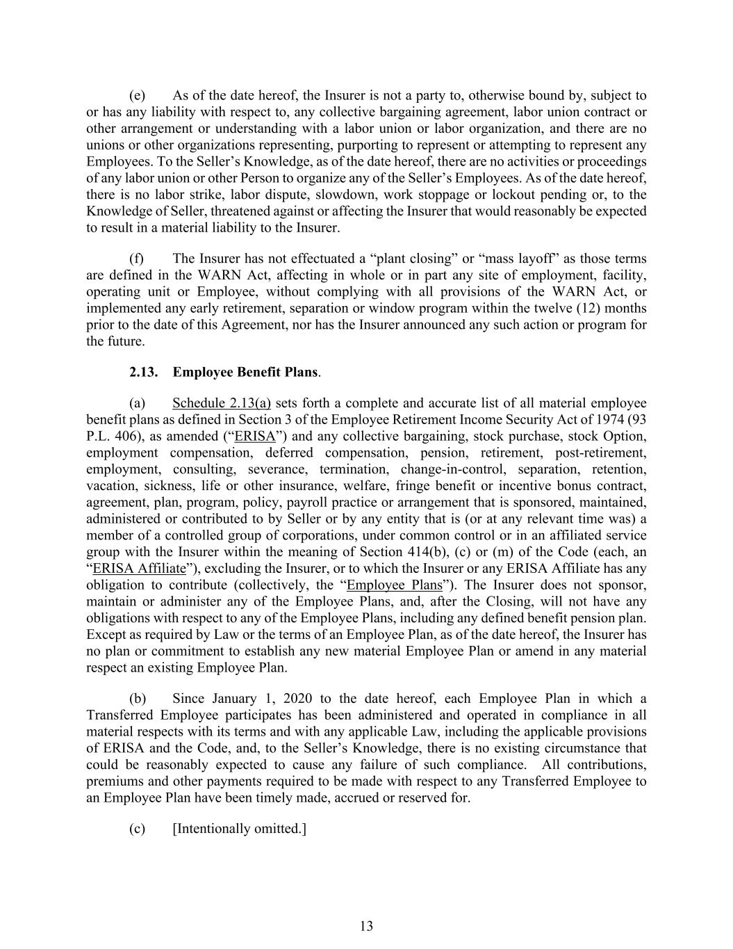 13 (e) As of the date hereof, the Insurer is not a party to, otherwise bound by, subject to or has any liability with respect to, any collective bargaining agreement, labor union contract or other arrangement or understanding with a labor union or labor organization, and there are no unions or other organizations representing, purporting to represent or attempting to represent any Employees. To the Seller’s Knowledge, as of the date hereof, there are no activities or proceedings of any labor union or other Person to organize any of the Seller’s Employees. As of the date hereof, there is no labor strike, labor dispute, slowdown, work stoppage or lockout pending or, to the Knowledge of Seller, threatened against or affecting the Insurer that would reasonably be expected to result in a material liability to the Insurer. (f) The Insurer has not effectuated a “plant closing” or “mass layoff” as those terms are defined in the WARN Act, affecting in whole or in part any site of employment, facility, operating unit or Employee, without complying with all provisions of the WARN Act, or implemented any early retirement, separation or window program within the twelve (12) months prior to the date of this Agreement, nor has the Insurer announced any such action or program for the future. 2.13. Employee Benefit Plans. (a) Schedule 2.13(a) sets forth a complete and accurate list of all material employee benefit plans as defined in Section 3 of the Employee Retirement Income Security Act of 1974 (93 P.L. 406), as amended (“ERISA”) and any collective bargaining, stock purchase, stock Option, employment compensation, deferred compensation, pension, retirement, post-retirement, employment, consulting, severance, termination, change-in-control, separation, retention, vacation, sickness, life or other insurance, welfare, fringe benefit or incentive bonus contract, agreement, plan, program, policy, payroll practice or arrangement that is sponsored, maintained, administered or contributed to by Seller or by any entity that is (or at any relevant time was) a member of a controlled group of corporations, under common control or in an affiliated service group with the Insurer within the meaning of Section 414(b), (c) or (m) of the Code (each, an “ERISA Affiliate”), excluding the Insurer, or to which the Insurer or any ERISA Affiliate has any obligation to contribute (collectively, the “Employee Plans”). The Insurer does not sponsor, maintain or administer any of the Employee Plans, and, after the Closing, will not have any obligations with respect to any of the Employee Plans, including any defined benefit pension plan. Except as required by Law or the terms of an Employee Plan, as of the date hereof, the Insurer has no plan or commitment to establish any new material Employee Plan or amend in any material respect an existing Employee Plan. (b) Since January 1, 2020 to the date hereof, each Employee Plan in which a Transferred Employee participates has been administered and operated in compliance in all material respects with its terms and with any applicable Law, including the applicable provisions of ERISA and the Code, and, to the Seller’s Knowledge, there is no existing circumstance that could be reasonably expected to cause any failure of such compliance. All contributions, premiums and other payments required to be made with respect to any Transferred Employee to an Employee Plan have been timely made, accrued or reserved for. (c) [Intentionally omitted.]