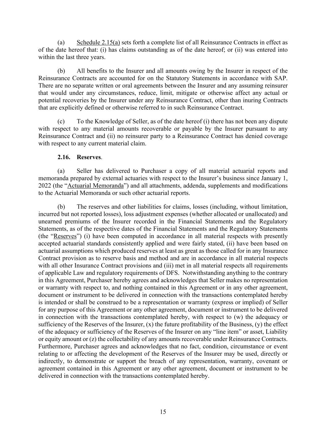 15 (a) Schedule 2.15(a) sets forth a complete list of all Reinsurance Contracts in effect as of the date hereof that: (i) has claims outstanding as of the date hereof; or (ii) was entered into within the last three years. (b) All benefits to the Insurer and all amounts owing by the Insurer in respect of the Reinsurance Contracts are accounted for on the Statutory Statements in accordance with SAP. There are no separate written or oral agreements between the Insurer and any assuming reinsurer that would under any circumstances, reduce, limit, mitigate or otherwise affect any actual or potential recoveries by the Insurer under any Reinsurance Contract, other than inuring Contracts that are explicitly defined or otherwise referred to in such Reinsurance Contract. (c) To the Knowledge of Seller, as of the date hereof (i) there has not been any dispute with respect to any material amounts recoverable or payable by the Insurer pursuant to any Reinsurance Contract and (ii) no reinsurer party to a Reinsurance Contract has denied coverage with respect to any current material claim. 2.16. Reserves. (a) Seller has delivered to Purchaser a copy of all material actuarial reports and memoranda prepared by external actuaries with respect to the Insurer’s business since January 1, 2022 (the “Actuarial Memoranda”) and all attachments, addenda, supplements and modifications to the Actuarial Memoranda or such other actuarial reports. (b) The reserves and other liabilities for claims, losses (including, without limitation, incurred but not reported losses), loss adjustment expenses (whether allocated or unallocated) and unearned premiums of the Insurer recorded in the Financial Statements and the Regulatory Statements, as of the respective dates of the Financial Statements and the Regulatory Statements (the “Reserves”) (i) have been computed in accordance in all material respects with presently accepted actuarial standards consistently applied and were fairly stated, (ii) have been based on actuarial assumptions which produced reserves at least as great as those called for in any Insurance Contract provision as to reserve basis and method and are in accordance in all material respects with all other Insurance Contract provisions and (iii) met in all material respects all requirements of applicable Law and regulatory requirements of DFS. Notwithstanding anything to the contrary in this Agreement, Purchaser hereby agrees and acknowledges that Seller makes no representation or warranty with respect to, and nothing contained in this Agreement or in any other agreement, document or instrument to be delivered in connection with the transactions contemplated hereby is intended or shall be construed to be a representation or warranty (express or implied) of Seller for any purpose of this Agreement or any other agreement, document or instrument to be delivered in connection with the transactions contemplated hereby, with respect to (w) the adequacy or sufficiency of the Reserves of the Insurer, (x) the future profitability of the Business, (y) the effect of the adequacy or sufficiency of the Reserves of the Insurer on any “line item” or asset, Liability or equity amount or (z) the collectability of any amounts recoverable under Reinsurance Contracts. Furthermore, Purchaser agrees and acknowledges that no fact, condition, circumstance or event relating to or affecting the development of the Reserves of the Insurer may be used, directly or indirectly, to demonstrate or support the breach of any representation, warranty, covenant or agreement contained in this Agreement or any other agreement, document or instrument to be delivered in connection with the transactions contemplated hereby.