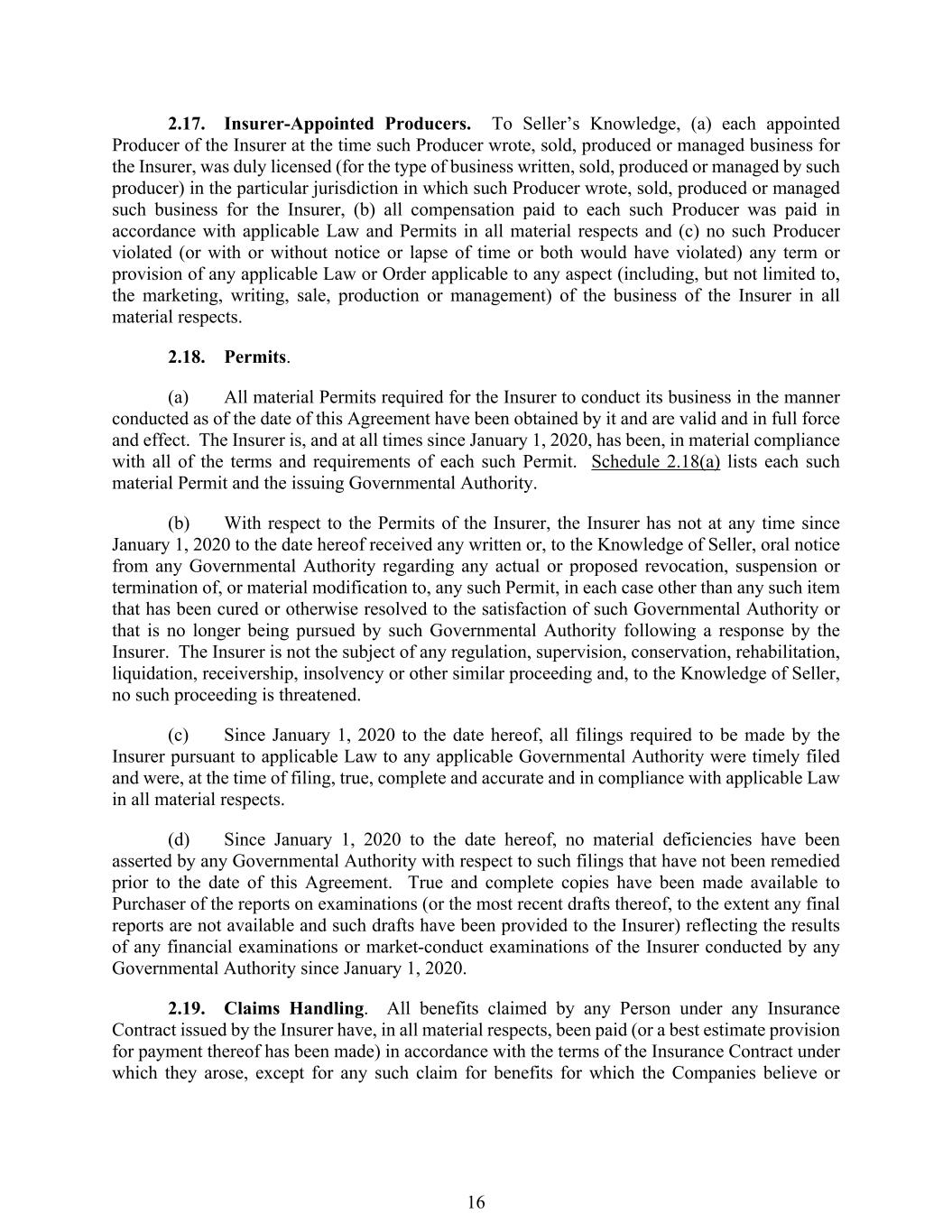 16 2.17. Insurer-Appointed Producers. To Seller’s Knowledge, (a) each appointed Producer of the Insurer at the time such Producer wrote, sold, produced or managed business for the Insurer, was duly licensed (for the type of business written, sold, produced or managed by such producer) in the particular jurisdiction in which such Producer wrote, sold, produced or managed such business for the Insurer, (b) all compensation paid to each such Producer was paid in accordance with applicable Law and Permits in all material respects and (c) no such Producer violated (or with or without notice or lapse of time or both would have violated) any term or provision of any applicable Law or Order applicable to any aspect (including, but not limited to, the marketing, writing, sale, production or management) of the business of the Insurer in all material respects. 2.18. Permits. (a) All material Permits required for the Insurer to conduct its business in the manner conducted as of the date of this Agreement have been obtained by it and are valid and in full force and effect. The Insurer is, and at all times since January 1, 2020, has been, in material compliance with all of the terms and requirements of each such Permit. Schedule 2.18(a) lists each such material Permit and the issuing Governmental Authority. (b) With respect to the Permits of the Insurer, the Insurer has not at any time since January 1, 2020 to the date hereof received any written or, to the Knowledge of Seller, oral notice from any Governmental Authority regarding any actual or proposed revocation, suspension or termination of, or material modification to, any such Permit, in each case other than any such item that has been cured or otherwise resolved to the satisfaction of such Governmental Authority or that is no longer being pursued by such Governmental Authority following a response by the Insurer. The Insurer is not the subject of any regulation, supervision, conservation, rehabilitation, liquidation, receivership, insolvency or other similar proceeding and, to the Knowledge of Seller, no such proceeding is threatened. (c) Since January 1, 2020 to the date hereof, all filings required to be made by the Insurer pursuant to applicable Law to any applicable Governmental Authority were timely filed and were, at the time of filing, true, complete and accurate and in compliance with applicable Law in all material respects. (d) Since January 1, 2020 to the date hereof, no material deficiencies have been asserted by any Governmental Authority with respect to such filings that have not been remedied prior to the date of this Agreement. True and complete copies have been made available to Purchaser of the reports on examinations (or the most recent drafts thereof, to the extent any final reports are not available and such drafts have been provided to the Insurer) reflecting the results of any financial examinations or market-conduct examinations of the Insurer conducted by any Governmental Authority since January 1, 2020. 2.19. Claims Handling. All benefits claimed by any Person under any Insurance Contract issued by the Insurer have, in all material respects, been paid (or a best estimate provision for payment thereof has been made) in accordance with the terms of the Insurance Contract under which they arose, except for any such claim for benefits for which the Companies believe or