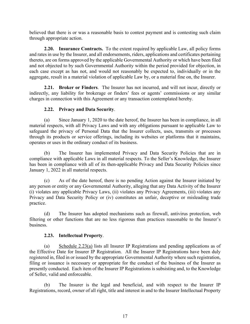 17 believed that there is or was a reasonable basis to contest payment and is contesting such claim through appropriate action. 2.20. Insurance Contracts. To the extent required by applicable Law, all policy forms and rates in use by the Insurer, and all endorsements, riders, applications and certificates pertaining thereto, are on forms approved by the applicable Governmental Authority or which have been filed and not objected to by such Governmental Authority within the period provided for objection, in each case except as has not, and would not reasonably be expected to, individually or in the aggregate, result in a material violation of applicable Law by, or a material fine on, the Insurer. 2.21. Broker or Finders. The Insurer has not incurred, and will not incur, directly or indirectly, any liability for brokerage or finders’ fees or agents’ commissions or any similar charges in connection with this Agreement or any transaction contemplated hereby. 2.22. Privacy and Data Security. (a) Since January 1, 2020 to the date hereof, the Insurer has been in compliance, in all material respects, with all Privacy Laws and with any obligations pursuant to applicable Law to safeguard the privacy of Personal Data that the Insurer collects, uses, transmits or processes through its products or service offerings, including its websites or platforms that it maintains, operates or uses in the ordinary conduct of its business. (b) The Insurer has implemented Privacy and Data Security Policies that are in compliance with applicable Laws in all material respects. To the Seller’s Knowledge, the Insurer has been in compliance with all of its then-applicable Privacy and Data Security Policies since January 1, 2022 in all material respects. (c) As of the date hereof, there is no pending Action against the Insurer initiated by any person or entity or any Governmental Authority, alleging that any Data Activity of the Insurer (i) violates any applicable Privacy Laws, (ii) violates any Privacy Agreements, (iii) violates any Privacy and Data Security Policy or (iv) constitutes an unfair, deceptive or misleading trade practice. (d) The Insurer has adopted mechanisms such as firewall, antivirus protection, web filtering or other functions that are no less rigorous than practices reasonable to the Insurer’s business. 2.23. Intellectual Property. (a) Schedule 2.23(a) lists all Insurer IP Registrations and pending applications as of the Effective Date for Insurer IP Registration. All the Insurer IP Registrations have been duly registered in, filed in or issued by the appropriate Governmental Authority where such registration, filing or issuance is necessary or appropriate for the conduct of the business of the Insurer as presently conducted. Each item of the Insurer IP Registrations is subsisting and, to the Knowledge of Seller, valid and enforceable. (b) The Insurer is the legal and beneficial, and with respect to the Insurer IP Registrations, record, owner of all right, title and interest in and to the Insurer Intellectual Property