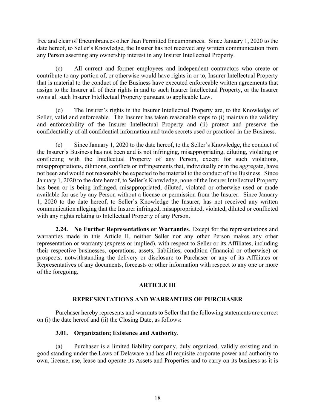 18 free and clear of Encumbrances other than Permitted Encumbrances. Since January 1, 2020 to the date hereof, to Seller’s Knowledge, the Insurer has not received any written communication from any Person asserting any ownership interest in any Insurer Intellectual Property. (c) All current and former employees and independent contractors who create or contribute to any portion of, or otherwise would have rights in or to, Insurer Intellectual Property that is material to the conduct of the Business have executed enforceable written agreements that assign to the Insurer all of their rights in and to such Insurer Intellectual Property, or the Insurer owns all such Insurer Intellectual Property pursuant to applicable Law. (d) The Insurer’s rights in the Insurer Intellectual Property are, to the Knowledge of Seller, valid and enforceable. The Insurer has taken reasonable steps to (i) maintain the validity and enforceability of the Insurer Intellectual Property and (ii) protect and preserve the confidentiality of all confidential information and trade secrets used or practiced in the Business. (e) Since January 1, 2020 to the date hereof, to the Seller’s Knowledge, the conduct of the Insurer’s Business has not been and is not infringing, misappropriating, diluting, violating or conflicting with the Intellectual Property of any Person, except for such violations, misappropriations, dilutions, conflicts or infringements that, individually or in the aggregate, have not been and would not reasonably be expected to be material to the conduct of the Business. Since January 1, 2020 to the date hereof, to Seller’s Knowledge, none of the Insurer Intellectual Property has been or is being infringed, misappropriated, diluted, violated or otherwise used or made available for use by any Person without a license or permission from the Insurer. Since January 1, 2020 to the date hereof, to Seller’s Knowledge the Insurer, has not received any written communication alleging that the Insurer infringed, misappropriated, violated, diluted or conflicted with any rights relating to Intellectual Property of any Person. 2.24. No Further Representations or Warranties. Except for the representations and warranties made in this Article II, neither Seller nor any other Person makes any other representation or warranty (express or implied), with respect to Seller or its Affiliates, including their respective businesses, operations, assets, liabilities, condition (financial or otherwise) or prospects, notwithstanding the delivery or disclosure to Purchaser or any of its Affiliates or Representatives of any documents, forecasts or other information with respect to any one or more of the foregoing. ARTICLE III REPRESENTATIONS AND WARRANTIES OF PURCHASER Purchaser hereby represents and warrants to Seller that the following statements are correct on (i) the date hereof and (ii) the Closing Date, as follows: 3.01. Organization; Existence and Authority. (a) Purchaser is a limited liability company, duly organized, validly existing and in good standing under the Laws of Delaware and has all requisite corporate power and authority to own, license, use, lease and operate its Assets and Properties and to carry on its business as it is