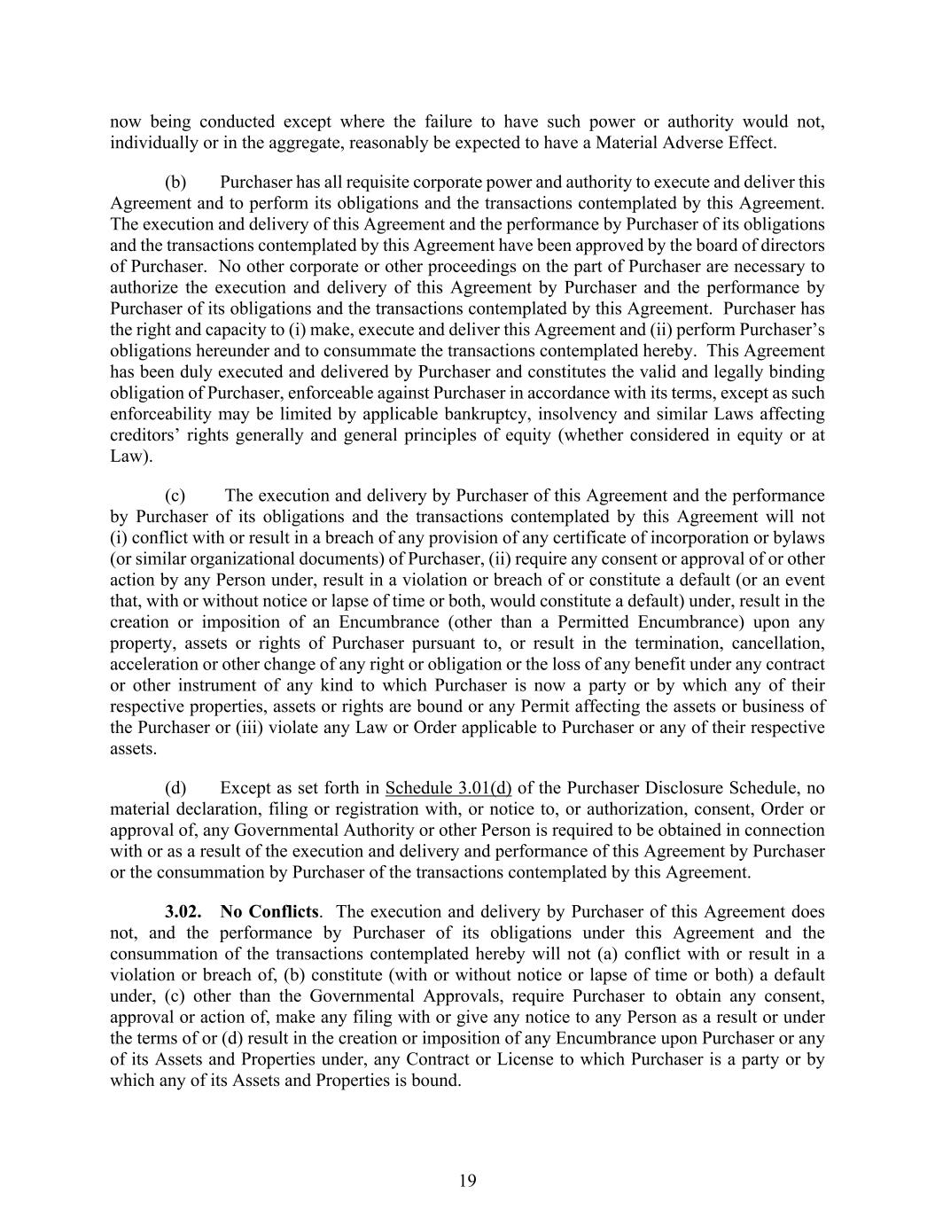 19 now being conducted except where the failure to have such power or authority would not, individually or in the aggregate, reasonably be expected to have a Material Adverse Effect. (b) Purchaser has all requisite corporate power and authority to execute and deliver this Agreement and to perform its obligations and the transactions contemplated by this Agreement. The execution and delivery of this Agreement and the performance by Purchaser of its obligations and the transactions contemplated by this Agreement have been approved by the board of directors of Purchaser. No other corporate or other proceedings on the part of Purchaser are necessary to authorize the execution and delivery of this Agreement by Purchaser and the performance by Purchaser of its obligations and the transactions contemplated by this Agreement. Purchaser has the right and capacity to (i) make, execute and deliver this Agreement and (ii) perform Purchaser’s obligations hereunder and to consummate the transactions contemplated hereby. This Agreement has been duly executed and delivered by Purchaser and constitutes the valid and legally binding obligation of Purchaser, enforceable against Purchaser in accordance with its terms, except as such enforceability may be limited by applicable bankruptcy, insolvency and similar Laws affecting creditors’ rights generally and general principles of equity (whether considered in equity or at Law). (c) The execution and delivery by Purchaser of this Agreement and the performance by Purchaser of its obligations and the transactions contemplated by this Agreement will not (i) conflict with or result in a breach of any provision of any certificate of incorporation or bylaws (or similar organizational documents) of Purchaser, (ii) require any consent or approval of or other action by any Person under, result in a violation or breach of or constitute a default (or an event that, with or without notice or lapse of time or both, would constitute a default) under, result in the creation or imposition of an Encumbrance (other than a Permitted Encumbrance) upon any property, assets or rights of Purchaser pursuant to, or result in the termination, cancellation, acceleration or other change of any right or obligation or the loss of any benefit under any contract or other instrument of any kind to which Purchaser is now a party or by which any of their respective properties, assets or rights are bound or any Permit affecting the assets or business of the Purchaser or (iii) violate any Law or Order applicable to Purchaser or any of their respective assets. (d) Except as set forth in Schedule 3.01(d) of the Purchaser Disclosure Schedule, no material declaration, filing or registration with, or notice to, or authorization, consent, Order or approval of, any Governmental Authority or other Person is required to be obtained in connection with or as a result of the execution and delivery and performance of this Agreement by Purchaser or the consummation by Purchaser of the transactions contemplated by this Agreement. 3.02. No Conflicts. The execution and delivery by Purchaser of this Agreement does not, and the performance by Purchaser of its obligations under this Agreement and the consummation of the transactions contemplated hereby will not (a) conflict with or result in a violation or breach of, (b) constitute (with or without notice or lapse of time or both) a default under, (c) other than the Governmental Approvals, require Purchaser to obtain any consent, approval or action of, make any filing with or give any notice to any Person as a result or under the terms of or (d) result in the creation or imposition of any Encumbrance upon Purchaser or any of its Assets and Properties under, any Contract or License to which Purchaser is a party or by which any of its Assets and Properties is bound.
