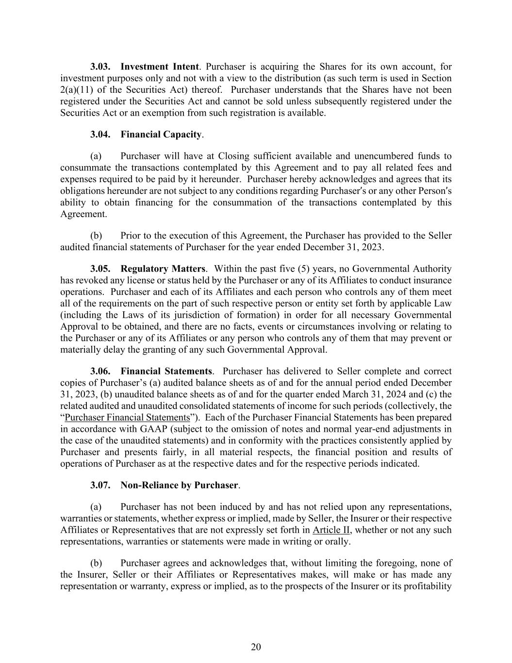 20 3.03. Investment Intent. Purchaser is acquiring the Shares for its own account, for investment purposes only and not with a view to the distribution (as such term is used in Section 2(a)(11) of the Securities Act) thereof. Purchaser understands that the Shares have not been registered under the Securities Act and cannot be sold unless subsequently registered under the Securities Act or an exemption from such registration is available. 3.04. Financial Capacity. (a) Purchaser will have at Closing sufficient available and unencumbered funds to consummate the transactions contemplated by this Agreement and to pay all related fees and expenses required to be paid by it hereunder. Purchaser hereby acknowledges and agrees that its obligations hereunder are not subject to any conditions regarding Purchaser’s or any other Person’s ability to obtain financing for the consummation of the transactions contemplated by this Agreement. (b) Prior to the execution of this Agreement, the Purchaser has provided to the Seller audited financial statements of Purchaser for the year ended December 31, 2023. 3.05. Regulatory Matters. Within the past five (5) years, no Governmental Authority has revoked any license or status held by the Purchaser or any of its Affiliates to conduct insurance operations. Purchaser and each of its Affiliates and each person who controls any of them meet all of the requirements on the part of such respective person or entity set forth by applicable Law (including the Laws of its jurisdiction of formation) in order for all necessary Governmental Approval to be obtained, and there are no facts, events or circumstances involving or relating to the Purchaser or any of its Affiliates or any person who controls any of them that may prevent or materially delay the granting of any such Governmental Approval. 3.06. Financial Statements. Purchaser has delivered to Seller complete and correct copies of Purchaser’s (a) audited balance sheets as of and for the annual period ended December 31, 2023, (b) unaudited balance sheets as of and for the quarter ended March 31, 2024 and (c) the related audited and unaudited consolidated statements of income for such periods (collectively, the “Purchaser Financial Statements”). Each of the Purchaser Financial Statements has been prepared in accordance with GAAP (subject to the omission of notes and normal year-end adjustments in the case of the unaudited statements) and in conformity with the practices consistently applied by Purchaser and presents fairly, in all material respects, the financial position and results of operations of Purchaser as at the respective dates and for the respective periods indicated. 3.07. Non-Reliance by Purchaser. (a) Purchaser has not been induced by and has not relied upon any representations, warranties or statements, whether express or implied, made by Seller, the Insurer or their respective Affiliates or Representatives that are not expressly set forth in Article II, whether or not any such representations, warranties or statements were made in writing or orally. (b) Purchaser agrees and acknowledges that, without limiting the foregoing, none of the Insurer, Seller or their Affiliates or Representatives makes, will make or has made any representation or warranty, express or implied, as to the prospects of the Insurer or its profitability