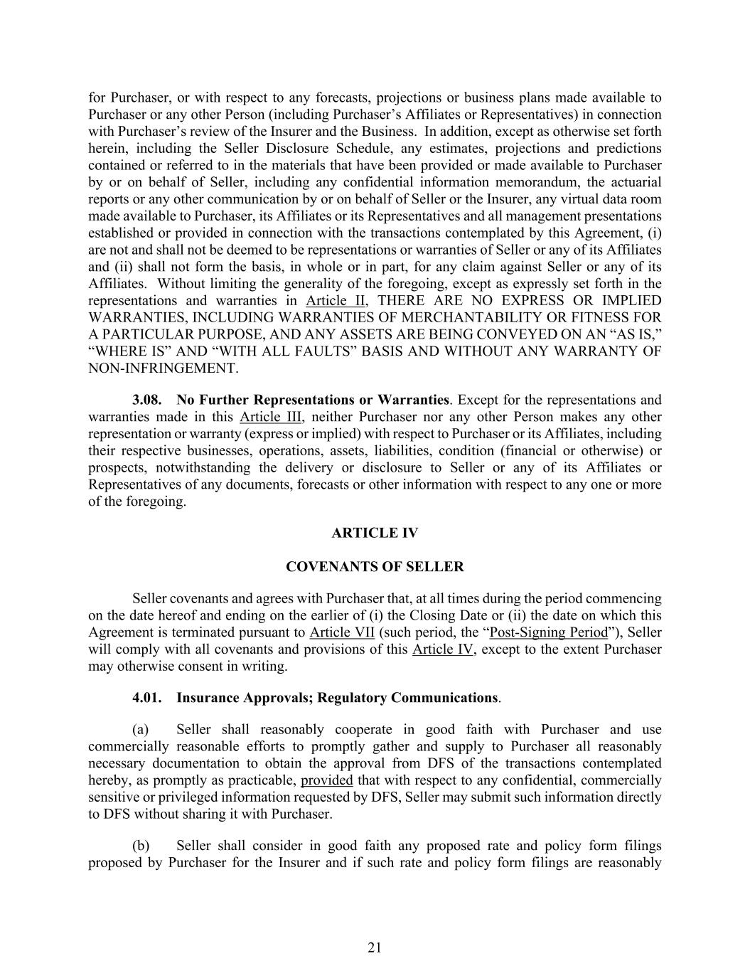 21 for Purchaser, or with respect to any forecasts, projections or business plans made available to Purchaser or any other Person (including Purchaser’s Affiliates or Representatives) in connection with Purchaser’s review of the Insurer and the Business. In addition, except as otherwise set forth herein, including the Seller Disclosure Schedule, any estimates, projections and predictions contained or referred to in the materials that have been provided or made available to Purchaser by or on behalf of Seller, including any confidential information memorandum, the actuarial reports or any other communication by or on behalf of Seller or the Insurer, any virtual data room made available to Purchaser, its Affiliates or its Representatives and all management presentations established or provided in connection with the transactions contemplated by this Agreement, (i) are not and shall not be deemed to be representations or warranties of Seller or any of its Affiliates and (ii) shall not form the basis, in whole or in part, for any claim against Seller or any of its Affiliates. Without limiting the generality of the foregoing, except as expressly set forth in the representations and warranties in Article II, THERE ARE NO EXPRESS OR IMPLIED WARRANTIES, INCLUDING WARRANTIES OF MERCHANTABILITY OR FITNESS FOR A PARTICULAR PURPOSE, AND ANY ASSETS ARE BEING CONVEYED ON AN “AS IS,” “WHERE IS” AND “WITH ALL FAULTS” BASIS AND WITHOUT ANY WARRANTY OF NON-INFRINGEMENT. 3.08. No Further Representations or Warranties. Except for the representations and warranties made in this Article III, neither Purchaser nor any other Person makes any other representation or warranty (express or implied) with respect to Purchaser or its Affiliates, including their respective businesses, operations, assets, liabilities, condition (financial or otherwise) or prospects, notwithstanding the delivery or disclosure to Seller or any of its Affiliates or Representatives of any documents, forecasts or other information with respect to any one or more of the foregoing. ARTICLE IV COVENANTS OF SELLER Seller covenants and agrees with Purchaser that, at all times during the period commencing on the date hereof and ending on the earlier of (i) the Closing Date or (ii) the date on which this Agreement is terminated pursuant to Article VII (such period, the “Post-Signing Period”), Seller will comply with all covenants and provisions of this Article IV, except to the extent Purchaser may otherwise consent in writing. 4.01. Insurance Approvals; Regulatory Communications. (a) Seller shall reasonably cooperate in good faith with Purchaser and use commercially reasonable efforts to promptly gather and supply to Purchaser all reasonably necessary documentation to obtain the approval from DFS of the transactions contemplated hereby, as promptly as practicable, provided that with respect to any confidential, commercially sensitive or privileged information requested by DFS, Seller may submit such information directly to DFS without sharing it with Purchaser. (b) Seller shall consider in good faith any proposed rate and policy form filings proposed by Purchaser for the Insurer and if such rate and policy form filings are reasonably