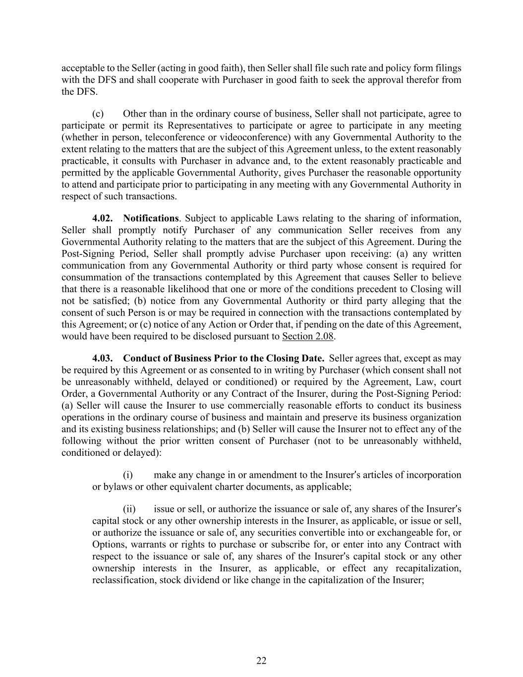 22 acceptable to the Seller (acting in good faith), then Seller shall file such rate and policy form filings with the DFS and shall cooperate with Purchaser in good faith to seek the approval therefor from the DFS. (c) Other than in the ordinary course of business, Seller shall not participate, agree to participate or permit its Representatives to participate or agree to participate in any meeting (whether in person, teleconference or videoconference) with any Governmental Authority to the extent relating to the matters that are the subject of this Agreement unless, to the extent reasonably practicable, it consults with Purchaser in advance and, to the extent reasonably practicable and permitted by the applicable Governmental Authority, gives Purchaser the reasonable opportunity to attend and participate prior to participating in any meeting with any Governmental Authority in respect of such transactions. 4.02. Notifications. Subject to applicable Laws relating to the sharing of information, Seller shall promptly notify Purchaser of any communication Seller receives from any Governmental Authority relating to the matters that are the subject of this Agreement. During the Post-Signing Period, Seller shall promptly advise Purchaser upon receiving: (a) any written communication from any Governmental Authority or third party whose consent is required for consummation of the transactions contemplated by this Agreement that causes Seller to believe that there is a reasonable likelihood that one or more of the conditions precedent to Closing will not be satisfied; (b) notice from any Governmental Authority or third party alleging that the consent of such Person is or may be required in connection with the transactions contemplated by this Agreement; or (c) notice of any Action or Order that, if pending on the date of this Agreement, would have been required to be disclosed pursuant to Section 2.08. 4.03. Conduct of Business Prior to the Closing Date. Seller agrees that, except as may be required by this Agreement or as consented to in writing by Purchaser (which consent shall not be unreasonably withheld, delayed or conditioned) or required by the Agreement, Law, court Order, a Governmental Authority or any Contract of the Insurer, during the Post-Signing Period: (a) Seller will cause the Insurer to use commercially reasonable efforts to conduct its business operations in the ordinary course of business and maintain and preserve its business organization and its existing business relationships; and (b) Seller will cause the Insurer not to effect any of the following without the prior written consent of Purchaser (not to be unreasonably withheld, conditioned or delayed): (i) make any change in or amendment to the Insurer’s articles of incorporation or bylaws or other equivalent charter documents, as applicable; (ii) issue or sell, or authorize the issuance or sale of, any shares of the Insurer’s capital stock or any other ownership interests in the Insurer, as applicable, or issue or sell, or authorize the issuance or sale of, any securities convertible into or exchangeable for, or Options, warrants or rights to purchase or subscribe for, or enter into any Contract with respect to the issuance or sale of, any shares of the Insurer’s capital stock or any other ownership interests in the Insurer, as applicable, or effect any recapitalization, reclassification, stock dividend or like change in the capitalization of the Insurer;