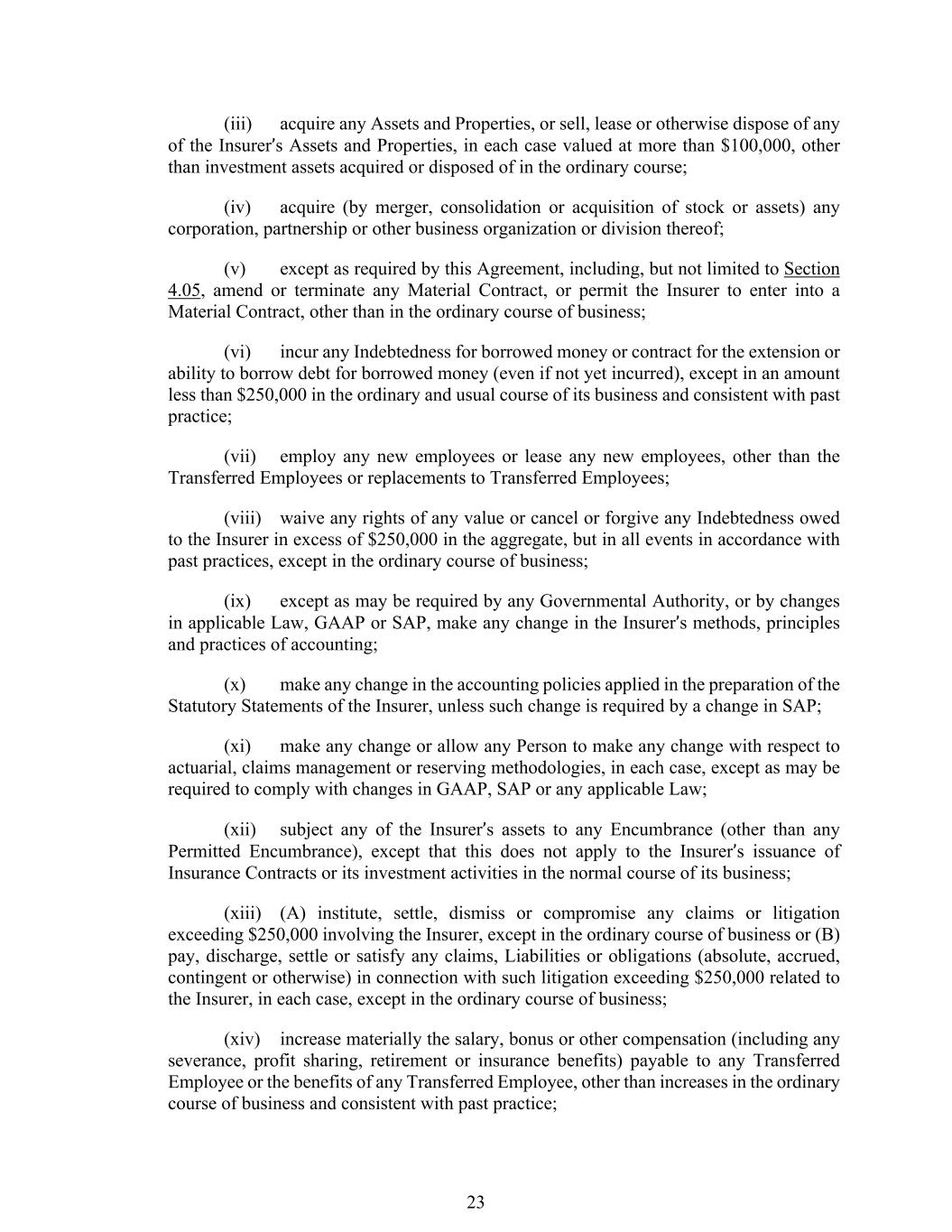23 (iii) acquire any Assets and Properties, or sell, lease or otherwise dispose of any of the Insurer’s Assets and Properties, in each case valued at more than $100,000, other than investment assets acquired or disposed of in the ordinary course; (iv) acquire (by merger, consolidation or acquisition of stock or assets) any corporation, partnership or other business organization or division thereof; (v) except as required by this Agreement, including, but not limited to Section 4.05, amend or terminate any Material Contract, or permit the Insurer to enter into a Material Contract, other than in the ordinary course of business; (vi) incur any Indebtedness for borrowed money or contract for the extension or ability to borrow debt for borrowed money (even if not yet incurred), except in an amount less than $250,000 in the ordinary and usual course of its business and consistent with past practice; (vii) employ any new employees or lease any new employees, other than the Transferred Employees or replacements to Transferred Employees; (viii) waive any rights of any value or cancel or forgive any Indebtedness owed to the Insurer in excess of $250,000 in the aggregate, but in all events in accordance with past practices, except in the ordinary course of business; (ix) except as may be required by any Governmental Authority, or by changes in applicable Law, GAAP or SAP, make any change in the Insurer’s methods, principles and practices of accounting; (x) make any change in the accounting policies applied in the preparation of the Statutory Statements of the Insurer, unless such change is required by a change in SAP; (xi) make any change or allow any Person to make any change with respect to actuarial, claims management or reserving methodologies, in each case, except as may be required to comply with changes in GAAP, SAP or any applicable Law; (xii) subject any of the Insurer’s assets to any Encumbrance (other than any Permitted Encumbrance), except that this does not apply to the Insurer’s issuance of Insurance Contracts or its investment activities in the normal course of its business; (xiii) (A) institute, settle, dismiss or compromise any claims or litigation exceeding $250,000 involving the Insurer, except in the ordinary course of business or (B) pay, discharge, settle or satisfy any claims, Liabilities or obligations (absolute, accrued, contingent or otherwise) in connection with such litigation exceeding $250,000 related to the Insurer, in each case, except in the ordinary course of business; (xiv) increase materially the salary, bonus or other compensation (including any severance, profit sharing, retirement or insurance benefits) payable to any Transferred Employee or the benefits of any Transferred Employee, other than increases in the ordinary course of business and consistent with past practice;