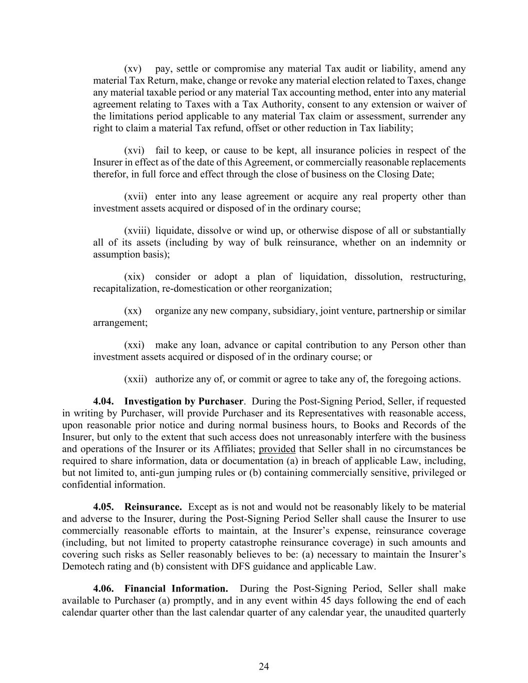 24 (xv) pay, settle or compromise any material Tax audit or liability, amend any material Tax Return, make, change or revoke any material election related to Taxes, change any material taxable period or any material Tax accounting method, enter into any material agreement relating to Taxes with a Tax Authority, consent to any extension or waiver of the limitations period applicable to any material Tax claim or assessment, surrender any right to claim a material Tax refund, offset or other reduction in Tax liability; (xvi) fail to keep, or cause to be kept, all insurance policies in respect of the Insurer in effect as of the date of this Agreement, or commercially reasonable replacements therefor, in full force and effect through the close of business on the Closing Date; (xvii) enter into any lease agreement or acquire any real property other than investment assets acquired or disposed of in the ordinary course; (xviii) liquidate, dissolve or wind up, or otherwise dispose of all or substantially all of its assets (including by way of bulk reinsurance, whether on an indemnity or assumption basis); (xix) consider or adopt a plan of liquidation, dissolution, restructuring, recapitalization, re-domestication or other reorganization; (xx) organize any new company, subsidiary, joint venture, partnership or similar arrangement; (xxi) make any loan, advance or capital contribution to any Person other than investment assets acquired or disposed of in the ordinary course; or (xxii) authorize any of, or commit or agree to take any of, the foregoing actions. 4.04. Investigation by Purchaser. During the Post-Signing Period, Seller, if requested in writing by Purchaser, will provide Purchaser and its Representatives with reasonable access, upon reasonable prior notice and during normal business hours, to Books and Records of the Insurer, but only to the extent that such access does not unreasonably interfere with the business and operations of the Insurer or its Affiliates; provided that Seller shall in no circumstances be required to share information, data or documentation (a) in breach of applicable Law, including, but not limited to, anti-gun jumping rules or (b) containing commercially sensitive, privileged or confidential information. 4.05. Reinsurance. Except as is not and would not be reasonably likely to be material and adverse to the Insurer, during the Post-Signing Period Seller shall cause the Insurer to use commercially reasonable efforts to maintain, at the Insurer’s expense, reinsurance coverage (including, but not limited to property catastrophe reinsurance coverage) in such amounts and covering such risks as Seller reasonably believes to be: (a) necessary to maintain the Insurer’s Demotech rating and (b) consistent with DFS guidance and applicable Law. 4.06. Financial Information. During the Post-Signing Period, Seller shall make available to Purchaser (a) promptly, and in any event within 45 days following the end of each calendar quarter other than the last calendar quarter of any calendar year, the unaudited quarterly