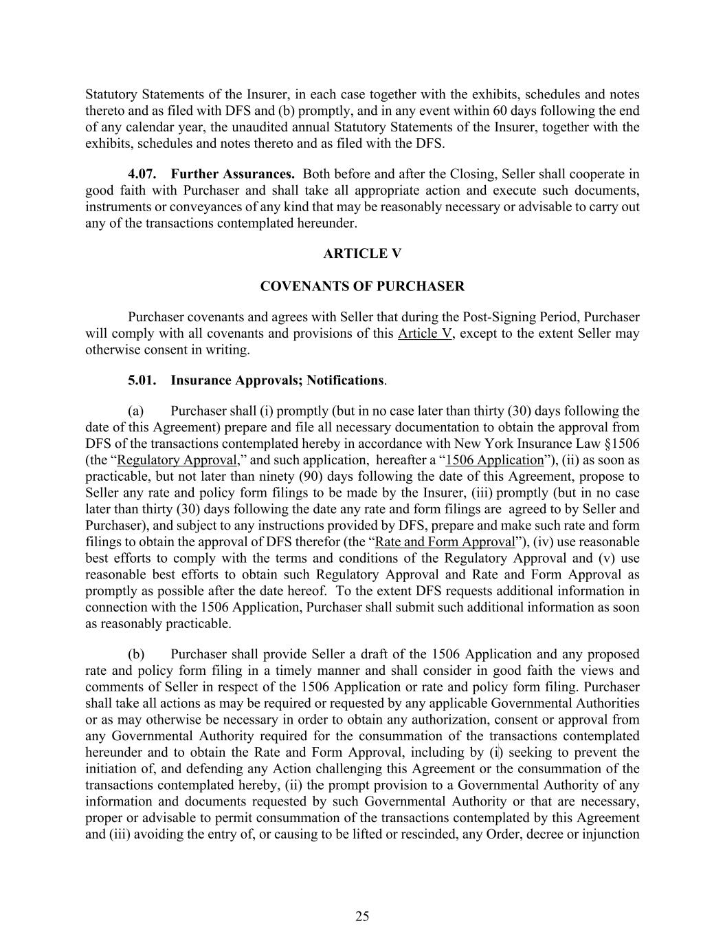 25 Statutory Statements of the Insurer, in each case together with the exhibits, schedules and notes thereto and as filed with DFS and (b) promptly, and in any event within 60 days following the end of any calendar year, the unaudited annual Statutory Statements of the Insurer, together with the exhibits, schedules and notes thereto and as filed with the DFS. 4.07. Further Assurances. Both before and after the Closing, Seller shall cooperate in good faith with Purchaser and shall take all appropriate action and execute such documents, instruments or conveyances of any kind that may be reasonably necessary or advisable to carry out any of the transactions contemplated hereunder. ARTICLE V COVENANTS OF PURCHASER Purchaser covenants and agrees with Seller that during the Post-Signing Period, Purchaser will comply with all covenants and provisions of this Article V, except to the extent Seller may otherwise consent in writing. 5.01. Insurance Approvals; Notifications. (a) Purchaser shall (i) promptly (but in no case later than thirty (30) days following the date of this Agreement) prepare and file all necessary documentation to obtain the approval from DFS of the transactions contemplated hereby in accordance with New York Insurance Law §1506 (the “Regulatory Approval,” and such application, hereafter a “1506 Application”), (ii) as soon as practicable, but not later than ninety (90) days following the date of this Agreement, propose to Seller any rate and policy form filings to be made by the Insurer, (iii) promptly (but in no case later than thirty (30) days following the date any rate and form filings are agreed to by Seller and Purchaser), and subject to any instructions provided by DFS, prepare and make such rate and form filings to obtain the approval of DFS therefor (the “Rate and Form Approval”), (iv) use reasonable best efforts to comply with the terms and conditions of the Regulatory Approval and (v) use reasonable best efforts to obtain such Regulatory Approval and Rate and Form Approval as promptly as possible after the date hereof. To the extent DFS requests additional information in connection with the 1506 Application, Purchaser shall submit such additional information as soon as reasonably practicable. (b) Purchaser shall provide Seller a draft of the 1506 Application and any proposed rate and policy form filing in a timely manner and shall consider in good faith the views and comments of Seller in respect of the 1506 Application or rate and policy form filing. Purchaser shall take all actions as may be required or requested by any applicable Governmental Authorities or as may otherwise be necessary in order to obtain any authorization, consent or approval from any Governmental Authority required for the consummation of the transactions contemplated hereunder and to obtain the Rate and Form Approval, including by (i) seeking to prevent the initiation of, and defending any Action challenging this Agreement or the consummation of the transactions contemplated hereby, (ii) the prompt provision to a Governmental Authority of any information and documents requested by such Governmental Authority or that are necessary, proper or advisable to permit consummation of the transactions contemplated by this Agreement and (iii) avoiding the entry of, or causing to be lifted or rescinded, any Order, decree or injunction