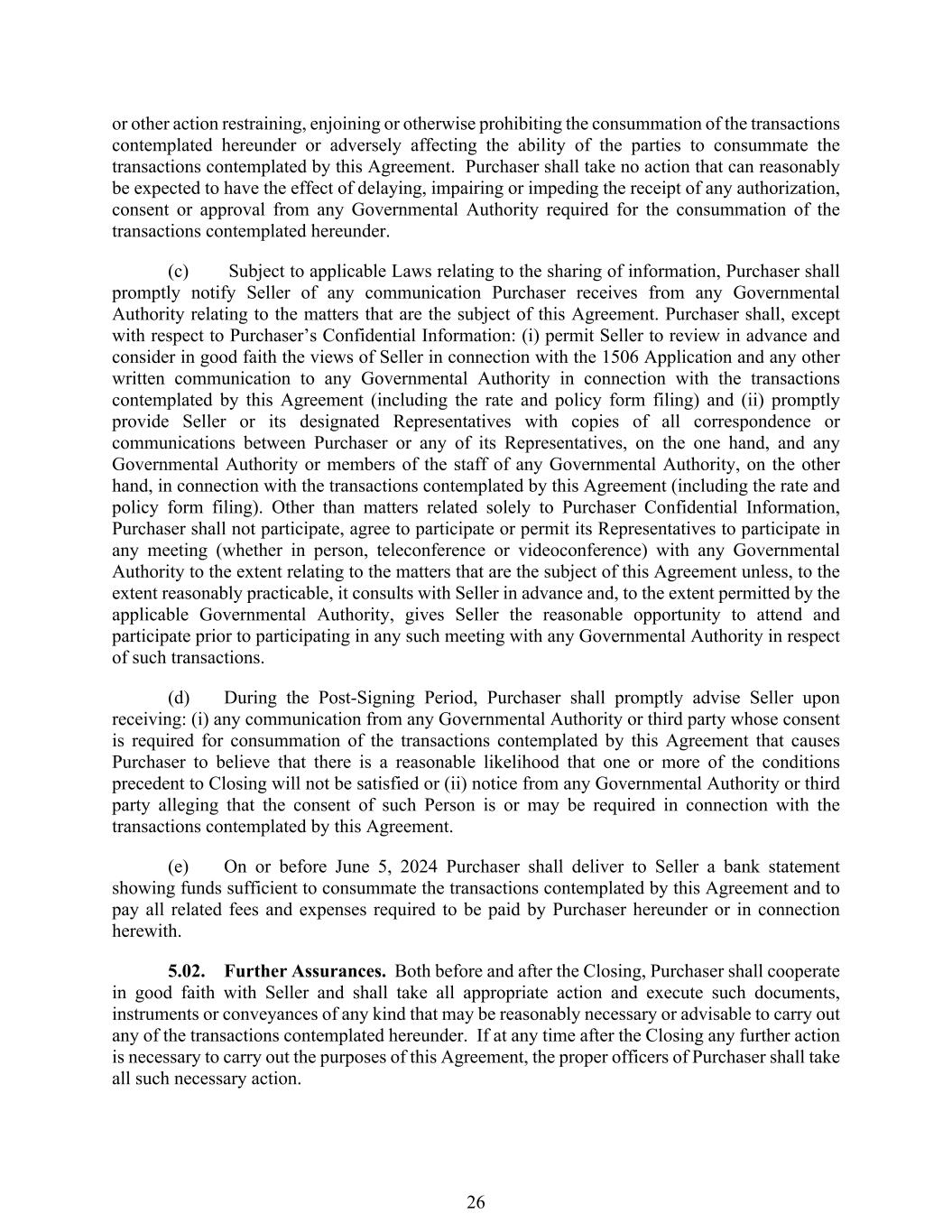 26 or other action restraining, enjoining or otherwise prohibiting the consummation of the transactions contemplated hereunder or adversely affecting the ability of the parties to consummate the transactions contemplated by this Agreement. Purchaser shall take no action that can reasonably be expected to have the effect of delaying, impairing or impeding the receipt of any authorization, consent or approval from any Governmental Authority required for the consummation of the transactions contemplated hereunder. (c) Subject to applicable Laws relating to the sharing of information, Purchaser shall promptly notify Seller of any communication Purchaser receives from any Governmental Authority relating to the matters that are the subject of this Agreement. Purchaser shall, except with respect to Purchaser’s Confidential Information: (i) permit Seller to review in advance and consider in good faith the views of Seller in connection with the 1506 Application and any other written communication to any Governmental Authority in connection with the transactions contemplated by this Agreement (including the rate and policy form filing) and (ii) promptly provide Seller or its designated Representatives with copies of all correspondence or communications between Purchaser or any of its Representatives, on the one hand, and any Governmental Authority or members of the staff of any Governmental Authority, on the other hand, in connection with the transactions contemplated by this Agreement (including the rate and policy form filing). Other than matters related solely to Purchaser Confidential Information, Purchaser shall not participate, agree to participate or permit its Representatives to participate in any meeting (whether in person, teleconference or videoconference) with any Governmental Authority to the extent relating to the matters that are the subject of this Agreement unless, to the extent reasonably practicable, it consults with Seller in advance and, to the extent permitted by the applicable Governmental Authority, gives Seller the reasonable opportunity to attend and participate prior to participating in any such meeting with any Governmental Authority in respect of such transactions. (d) During the Post-Signing Period, Purchaser shall promptly advise Seller upon receiving: (i) any communication from any Governmental Authority or third party whose consent is required for consummation of the transactions contemplated by this Agreement that causes Purchaser to believe that there is a reasonable likelihood that one or more of the conditions precedent to Closing will not be satisfied or (ii) notice from any Governmental Authority or third party alleging that the consent of such Person is or may be required in connection with the transactions contemplated by this Agreement. (e) On or before June 5, 2024 Purchaser shall deliver to Seller a bank statement showing funds sufficient to consummate the transactions contemplated by this Agreement and to pay all related fees and expenses required to be paid by Purchaser hereunder or in connection herewith. 5.02. Further Assurances. Both before and after the Closing, Purchaser shall cooperate in good faith with Seller and shall take all appropriate action and execute such documents, instruments or conveyances of any kind that may be reasonably necessary or advisable to carry out any of the transactions contemplated hereunder. If at any time after the Closing any further action is necessary to carry out the purposes of this Agreement, the proper officers of Purchaser shall take all such necessary action.