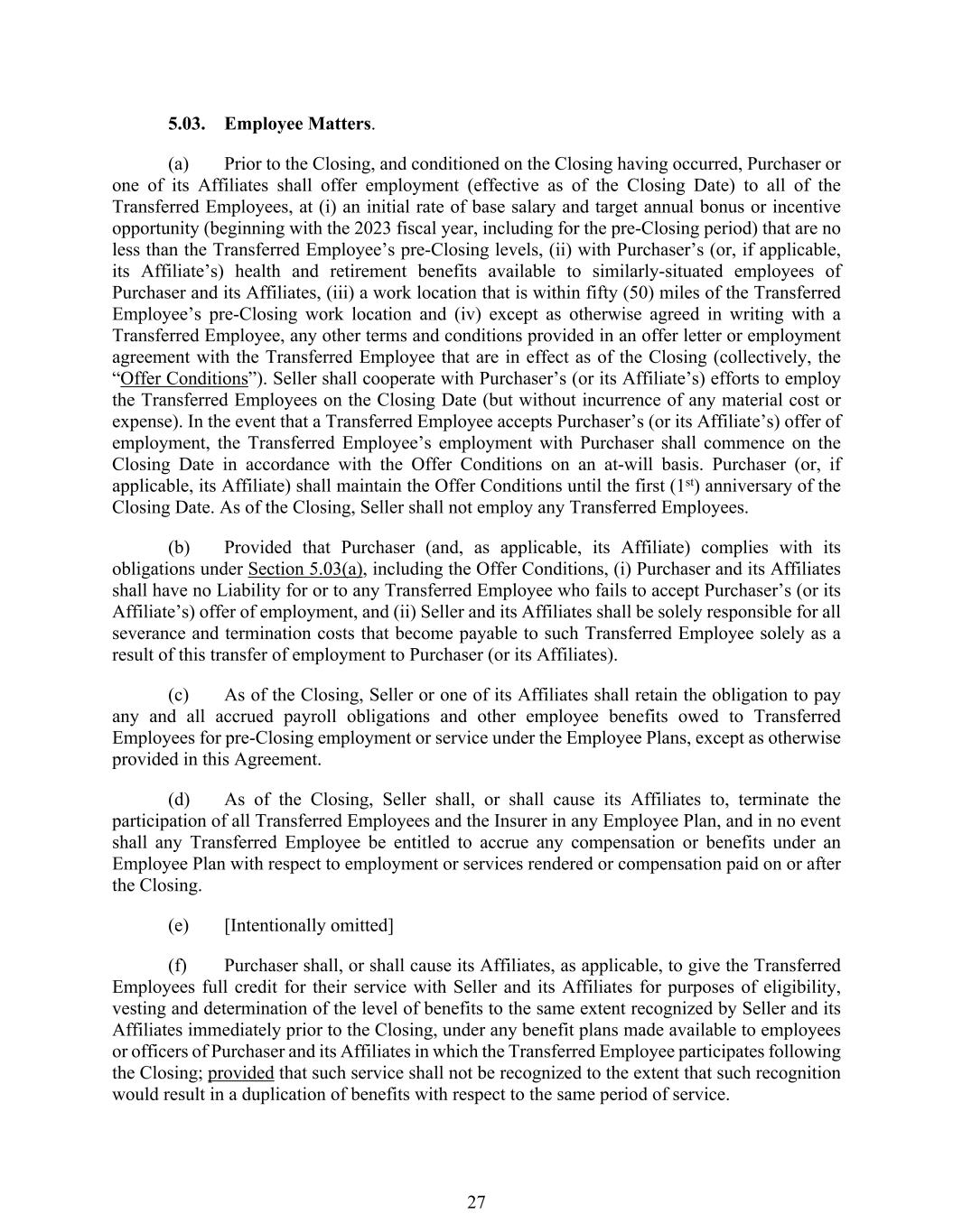 27 5.03. Employee Matters. (a) Prior to the Closing, and conditioned on the Closing having occurred, Purchaser or one of its Affiliates shall offer employment (effective as of the Closing Date) to all of the Transferred Employees, at (i) an initial rate of base salary and target annual bonus or incentive opportunity (beginning with the 2023 fiscal year, including for the pre-Closing period) that are no less than the Transferred Employee’s pre-Closing levels, (ii) with Purchaser’s (or, if applicable, its Affiliate’s) health and retirement benefits available to similarly-situated employees of Purchaser and its Affiliates, (iii) a work location that is within fifty (50) miles of the Transferred Employee’s pre-Closing work location and (iv) except as otherwise agreed in writing with a Transferred Employee, any other terms and conditions provided in an offer letter or employment agreement with the Transferred Employee that are in effect as of the Closing (collectively, the “Offer Conditions”). Seller shall cooperate with Purchaser’s (or its Affiliate’s) efforts to employ the Transferred Employees on the Closing Date (but without incurrence of any material cost or expense). In the event that a Transferred Employee accepts Purchaser’s (or its Affiliate’s) offer of employment, the Transferred Employee’s employment with Purchaser shall commence on the Closing Date in accordance with the Offer Conditions on an at-will basis. Purchaser (or, if applicable, its Affiliate) shall maintain the Offer Conditions until the first (1st) anniversary of the Closing Date. As of the Closing, Seller shall not employ any Transferred Employees. (b) Provided that Purchaser (and, as applicable, its Affiliate) complies with its obligations under Section 5.03(a), including the Offer Conditions, (i) Purchaser and its Affiliates shall have no Liability for or to any Transferred Employee who fails to accept Purchaser’s (or its Affiliate’s) offer of employment, and (ii) Seller and its Affiliates shall be solely responsible for all severance and termination costs that become payable to such Transferred Employee solely as a result of this transfer of employment to Purchaser (or its Affiliates). (c) As of the Closing, Seller or one of its Affiliates shall retain the obligation to pay any and all accrued payroll obligations and other employee benefits owed to Transferred Employees for pre-Closing employment or service under the Employee Plans, except as otherwise provided in this Agreement. (d) As of the Closing, Seller shall, or shall cause its Affiliates to, terminate the participation of all Transferred Employees and the Insurer in any Employee Plan, and in no event shall any Transferred Employee be entitled to accrue any compensation or benefits under an Employee Plan with respect to employment or services rendered or compensation paid on or after the Closing. (e) [Intentionally omitted] (f) Purchaser shall, or shall cause its Affiliates, as applicable, to give the Transferred Employees full credit for their service with Seller and its Affiliates for purposes of eligibility, vesting and determination of the level of benefits to the same extent recognized by Seller and its Affiliates immediately prior to the Closing, under any benefit plans made available to employees or officers of Purchaser and its Affiliates in which the Transferred Employee participates following the Closing; provided that such service shall not be recognized to the extent that such recognition would result in a duplication of benefits with respect to the same period of service.