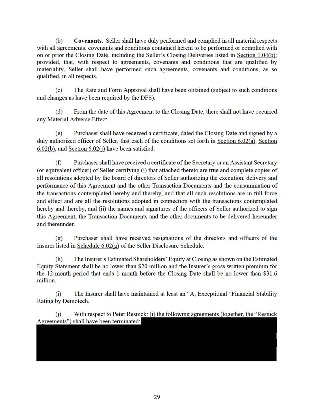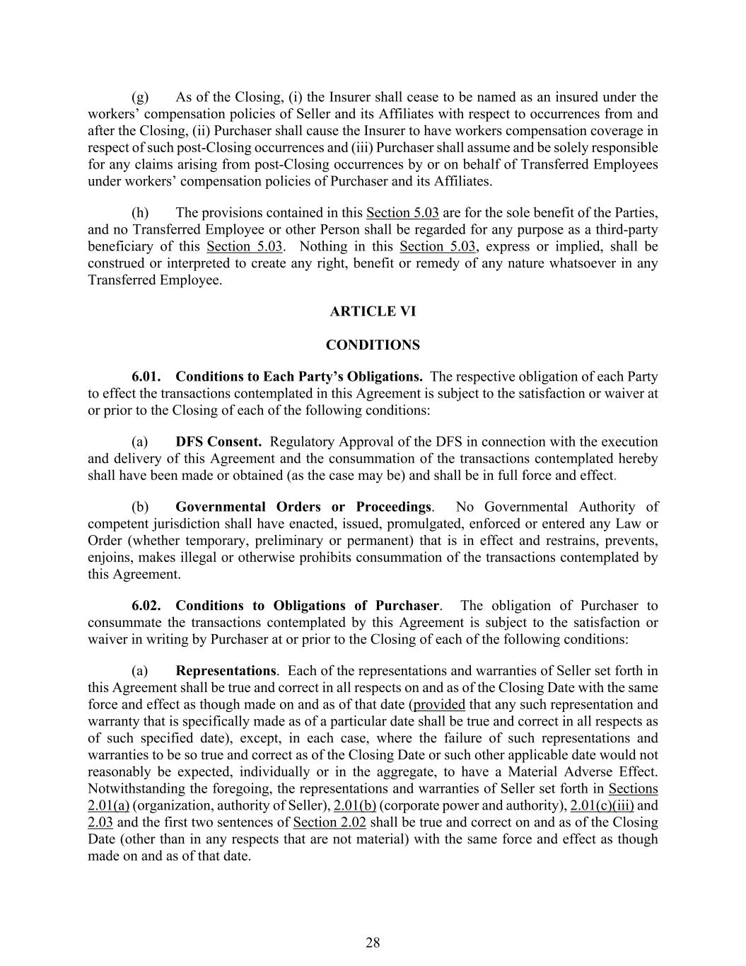 28 (g) As of the Closing, (i) the Insurer shall cease to be named as an insured under the workers’ compensation policies of Seller and its Affiliates with respect to occurrences from and after the Closing, (ii) Purchaser shall cause the Insurer to have workers compensation coverage in respect of such post-Closing occurrences and (iii) Purchaser shall assume and be solely responsible for any claims arising from post-Closing occurrences by or on behalf of Transferred Employees under workers’ compensation policies of Purchaser and its Affiliates. (h) The provisions contained in this Section 5.03 are for the sole benefit of the Parties, and no Transferred Employee or other Person shall be regarded for any purpose as a third-party beneficiary of this Section 5.03. Nothing in this Section 5.03, express or implied, shall be construed or interpreted to create any right, benefit or remedy of any nature whatsoever in any Transferred Employee. ARTICLE VI CONDITIONS 6.01. Conditions to Each Party’s Obligations. The respective obligation of each Party to effect the transactions contemplated in this Agreement is subject to the satisfaction or waiver at or prior to the Closing of each of the following conditions: (a) DFS Consent. Regulatory Approval of the DFS in connection with the execution and delivery of this Agreement and the consummation of the transactions contemplated hereby shall have been made or obtained (as the case may be) and shall be in full force and effect. (b) Governmental Orders or Proceedings. No Governmental Authority of competent jurisdiction shall have enacted, issued, promulgated, enforced or entered any Law or Order (whether temporary, preliminary or permanent) that is in effect and restrains, prevents, enjoins, makes illegal or otherwise prohibits consummation of the transactions contemplated by this Agreement. 6.02. Conditions to Obligations of Purchaser. The obligation of Purchaser to consummate the transactions contemplated by this Agreement is subject to the satisfaction or waiver in writing by Purchaser at or prior to the Closing of each of the following conditions: (a) Representations. Each of the representations and warranties of Seller set forth in this Agreement shall be true and correct in all respects on and as of the Closing Date with the same force and effect as though made on and as of that date (provided that any such representation and warranty that is specifically made as of a particular date shall be true and correct in all respects as of such specified date), except, in each case, where the failure of such representations and warranties to be so true and correct as of the Closing Date or such other applicable date would not reasonably be expected, individually or in the aggregate, to have a Material Adverse Effect. Notwithstanding the foregoing, the representations and warranties of Seller set forth in Sections 2.01(a) (organization, authority of Seller), 2.01(b) (corporate power and authority), 2.01(c)(iii) and 2.03 and the first two sentences of Section 2.02 shall be true and correct on and as of the Closing Date (other than in any respects that are not material) with the same force and effect as though made on and as of that date.