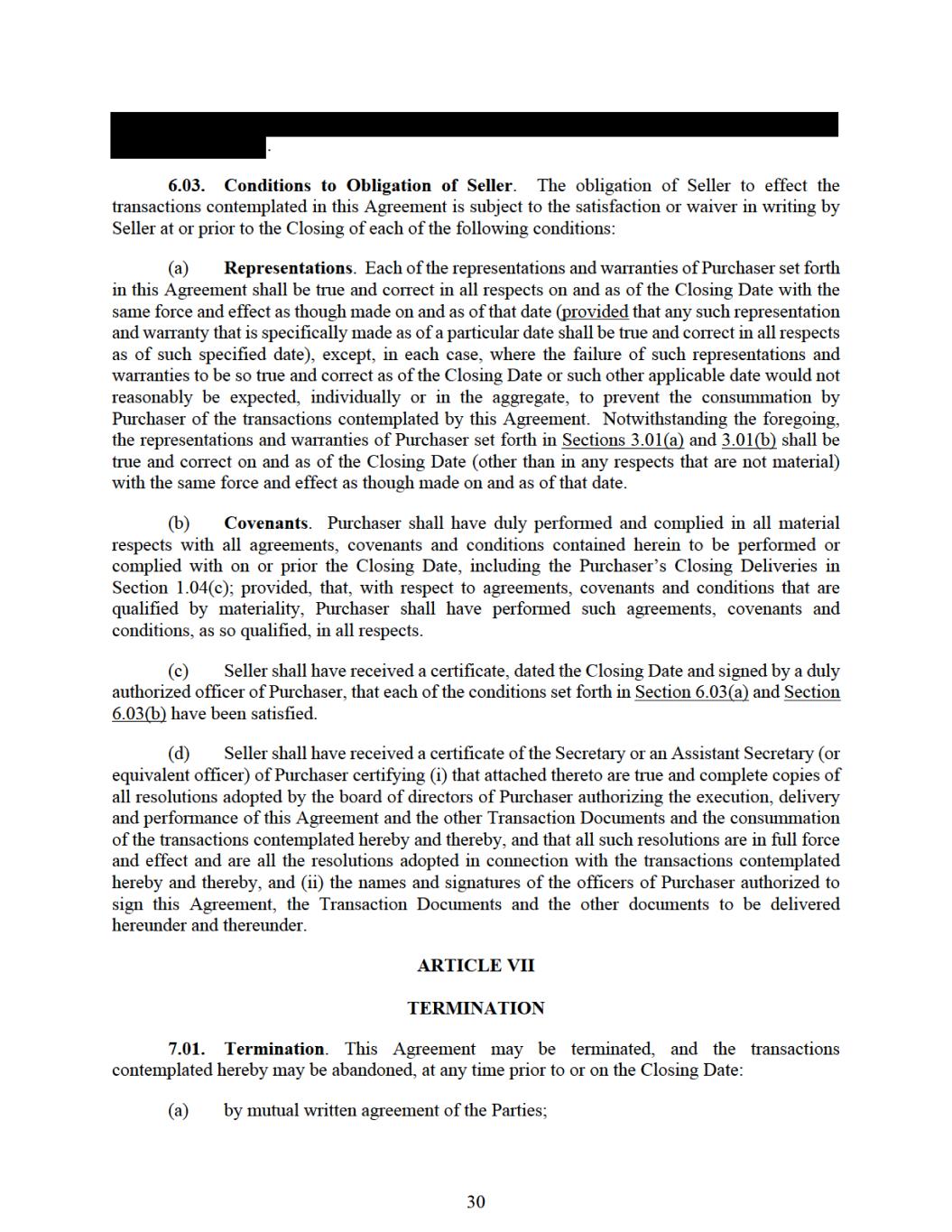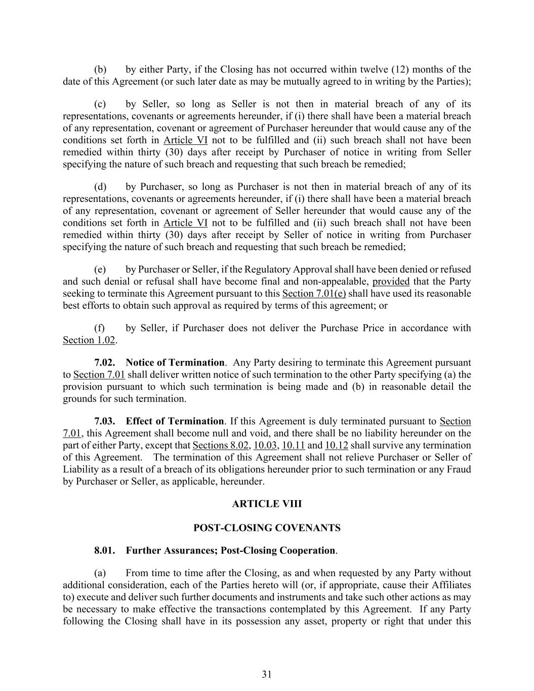 31 (b) by either Party, if the Closing has not occurred within twelve (12) months of the date of this Agreement (or such later date as may be mutually agreed to in writing by the Parties); (c) by Seller, so long as Seller is not then in material breach of any of its representations, covenants or agreements hereunder, if (i) there shall have been a material breach of any representation, covenant or agreement of Purchaser hereunder that would cause any of the conditions set forth in Article VI not to be fulfilled and (ii) such breach shall not have been remedied within thirty (30) days after receipt by Purchaser of notice in writing from Seller specifying the nature of such breach and requesting that such breach be remedied; (d) by Purchaser, so long as Purchaser is not then in material breach of any of its representations, covenants or agreements hereunder, if (i) there shall have been a material breach of any representation, covenant or agreement of Seller hereunder that would cause any of the conditions set forth in Article VI not to be fulfilled and (ii) such breach shall not have been remedied within thirty (30) days after receipt by Seller of notice in writing from Purchaser specifying the nature of such breach and requesting that such breach be remedied; (e) by Purchaser or Seller, if the Regulatory Approval shall have been denied or refused and such denial or refusal shall have become final and non-appealable, provided that the Party seeking to terminate this Agreement pursuant to this Section 7.01(e) shall have used its reasonable best efforts to obtain such approval as required by terms of this agreement; or (f) by Seller, if Purchaser does not deliver the Purchase Price in accordance with Section 1.02. 7.02. Notice of Termination. Any Party desiring to terminate this Agreement pursuant to Section 7.01 shall deliver written notice of such termination to the other Party specifying (a) the provision pursuant to which such termination is being made and (b) in reasonable detail the grounds for such termination. 7.03. Effect of Termination. If this Agreement is duly terminated pursuant to Section 7.01, this Agreement shall become null and void, and there shall be no liability hereunder on the part of either Party, except that Sections 8.02, 10.03, 10.11 and 10.12 shall survive any termination of this Agreement. The termination of this Agreement shall not relieve Purchaser or Seller of Liability as a result of a breach of its obligations hereunder prior to such termination or any Fraud by Purchaser or Seller, as applicable, hereunder. ARTICLE VIII POST-CLOSING COVENANTS 8.01. Further Assurances; Post-Closing Cooperation. (a) From time to time after the Closing, as and when requested by any Party without additional consideration, each of the Parties hereto will (or, if appropriate, cause their Affiliates to) execute and deliver such further documents and instruments and take such other actions as may be necessary to make effective the transactions contemplated by this Agreement. If any Party following the Closing shall have in its possession any asset, property or right that under this